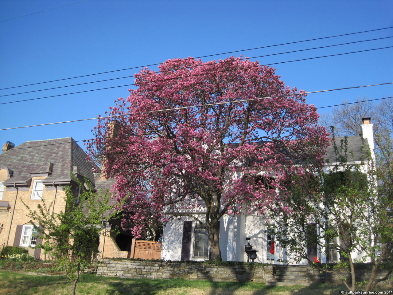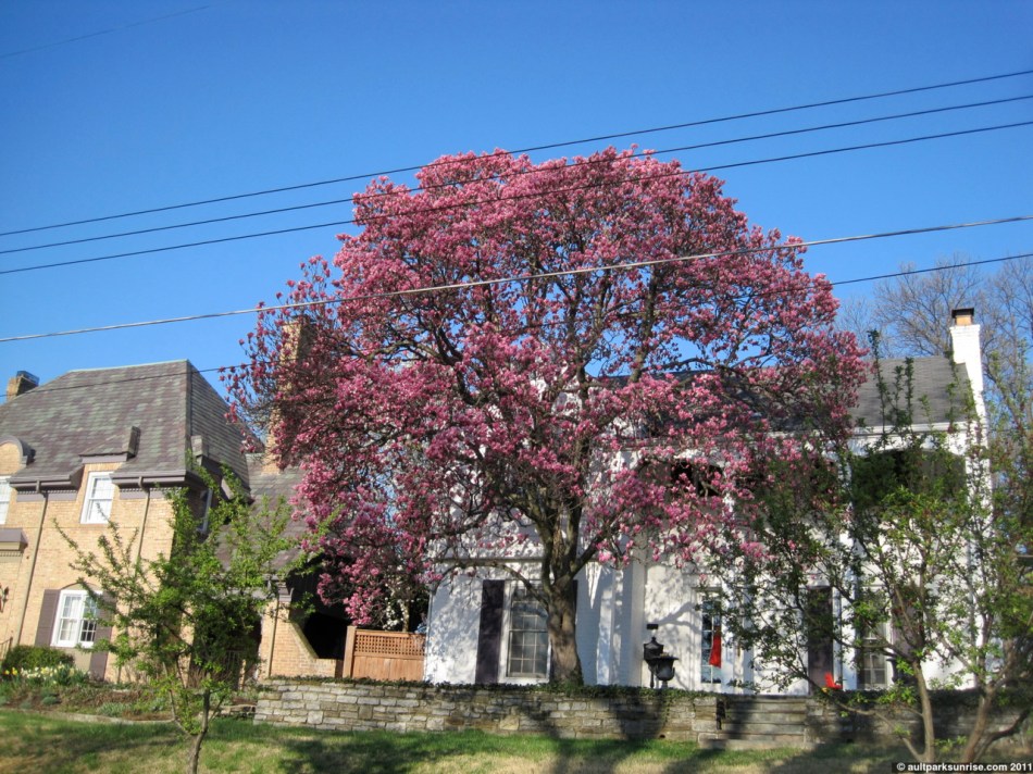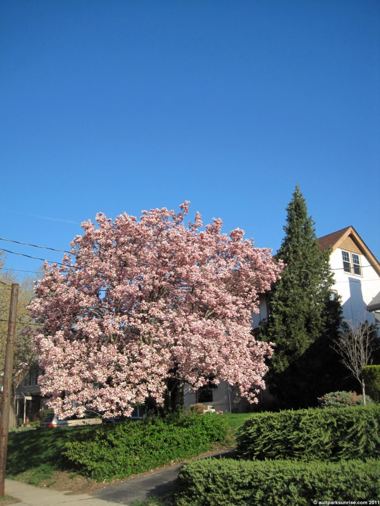 The nice thing about days like today is that not only does it make me think about better weather and warmer days, but it also lets me go back and look at those pictures from the previous sunrises with a different eye. I’ve got lots of pictures that are sitting on my hard drive, and they exist in beautiful contrast to days like today. So without further ado, here are some pictures from last Thursday. Most of them involve the blooming trees, and this is important because after the recent storms, most of the blooming trees have started to drop their pedals. Even the magnificent magnolias have begun shedding their spring colors in favor of a more conservative green leafy look. Some of these pictures were taken in Ault Park, the rest were taken around the neighborhoods in Mt. Lookout. If for some reason you see your home up here and you don’t like it, please let me know and I’ll remove it. I try not to put anything that you couldn’t see on Google Streetview.
