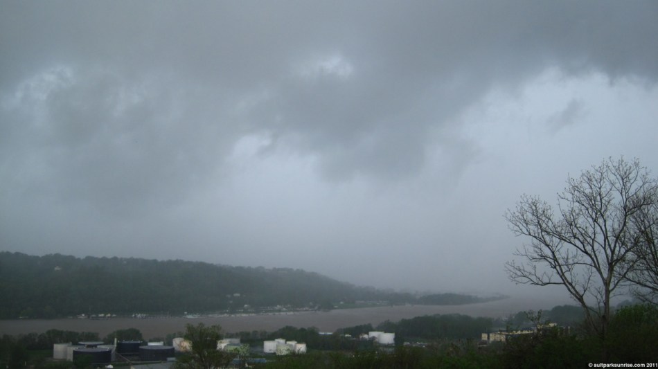 To give some reference for the front that moved in this morning, I have a picture that I took just after I got home from the sun rise. I heard tornado warnings at 8:45am and looked at the radar. There was a front moving in, and it was coming fast. I drove (because I didn’t want to get stranded!) up to Alms Park where we were just 12 hours prior. I caught the front just as it was moving up river at the bend. You can’t even see the Mt. Adams apartment buildings. Within 90 seconds the visibility had dropped completely and I was caught in a non-electrical beast of a rain storm. I ran to the pavilion, perhaps 60 yards away; by the time I got there I felt like I had jumped in a pool.