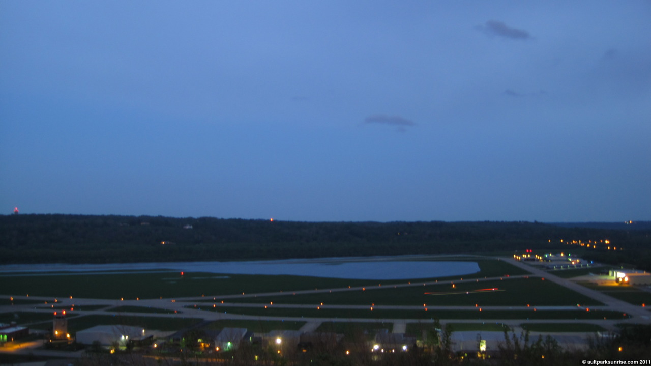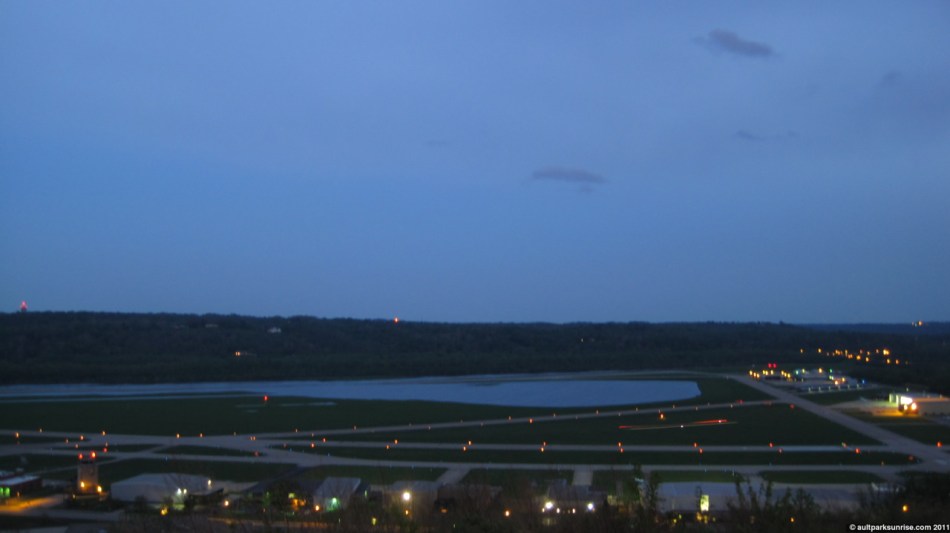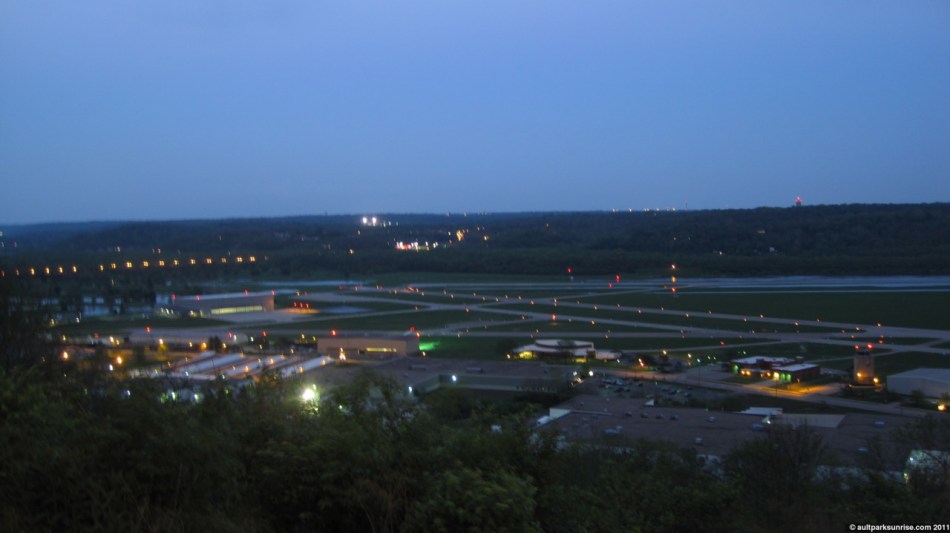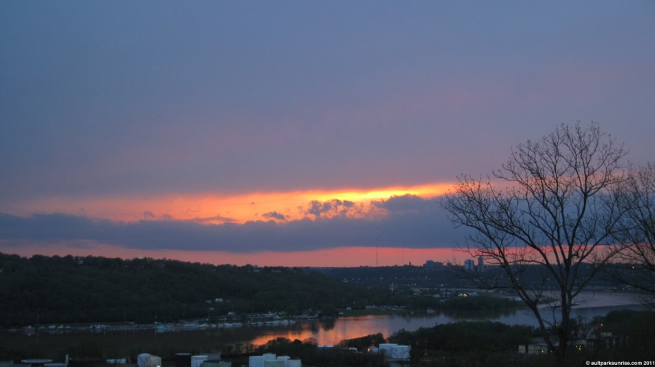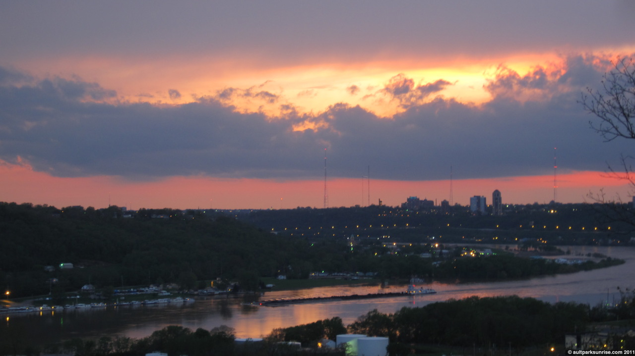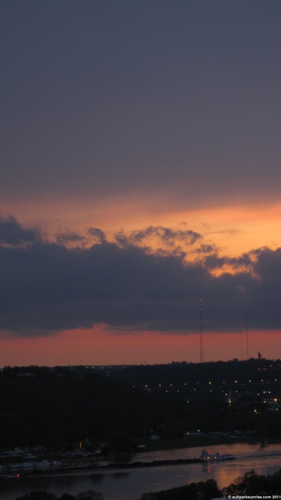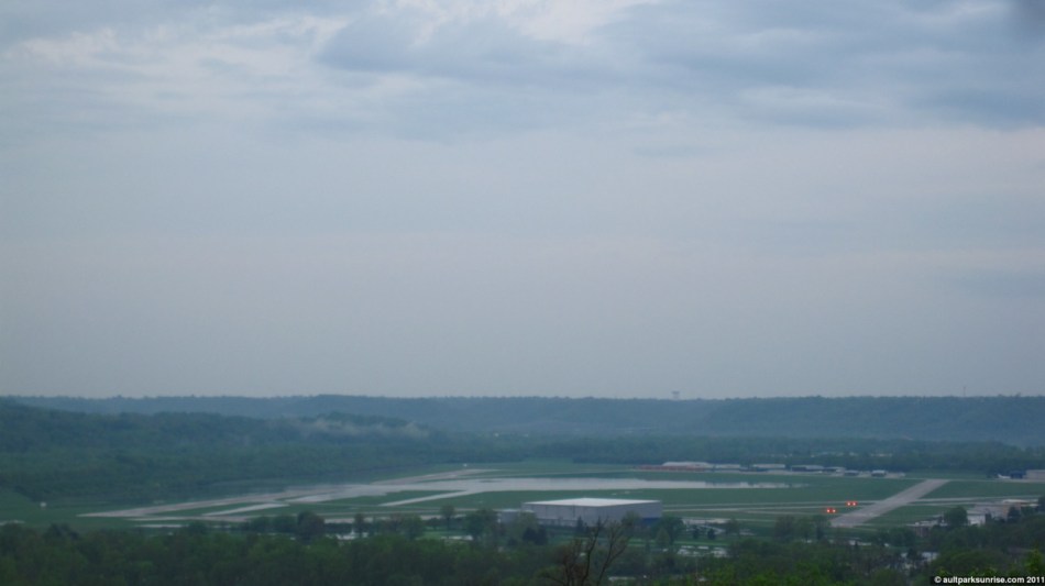 Speaking of Lunken Airfield, I have some pictures that Amanda and I took last night at Alms Park (one of the overlooks is 400ft above Lunken). We were curious how the sun set would look, and it also gave us an opportunity to check out the flooding of the “Jet Runway” from atop the overlook. The Alms Park Sunset was beautiful. Ault Park : Sunrise :: Alms Park : Sunset. It was similar to the morning sunrise (from last night) in that the clouds mostly hid the sun from view but it provided beautiful highlights. A barge was coming up the Ohio River, sending ripples across the bend. It was moving pretty slow compared to the one I raced a couple of weeks ago. Check out how far down the river you can see, below you can see a picture taken this morning as the front came through moving east.