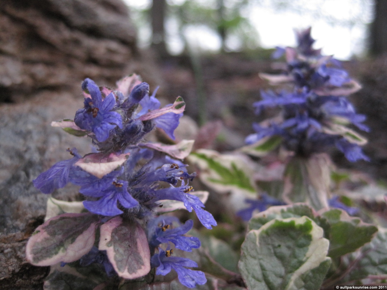 There are patches of a dark green crawling plant along the overlook. It is starting to bloom  these small purple flowers.
