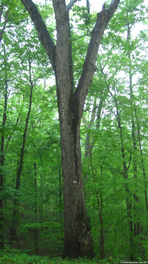 Having forgotten completely about the idea of just sitting on the bench and drinking my coffee, I proceeded to bike through the arboretum in search of thick fog. The pavilion, being up on the hill relative to the center lawn, has a tendency to block most of the wind and fog blowing in from the valley. Around to the side, however, the old growth forest was thick with fog. I ventured into the trail head to what the forest looked like in the morning haze. I almost couldn’t recognize the forest. Since my last visit into the forest, about a week ago, the deciduous leaves have come to almost full bloom. The visibility has decreased drastically and will only get “worse” until the early summer, when you can be 10 feet from another hiker and have no idea. One of the trees coming into the trail is an old hickory. I only know that because it is labeled, heh.