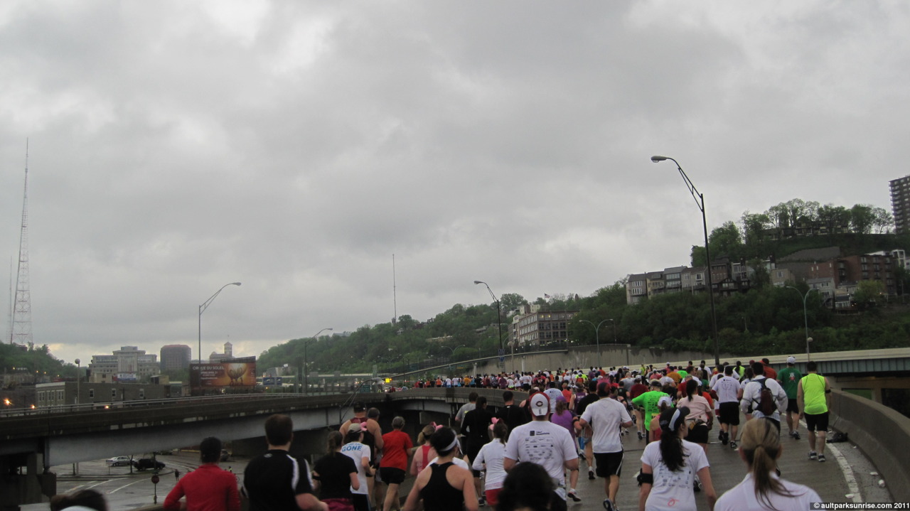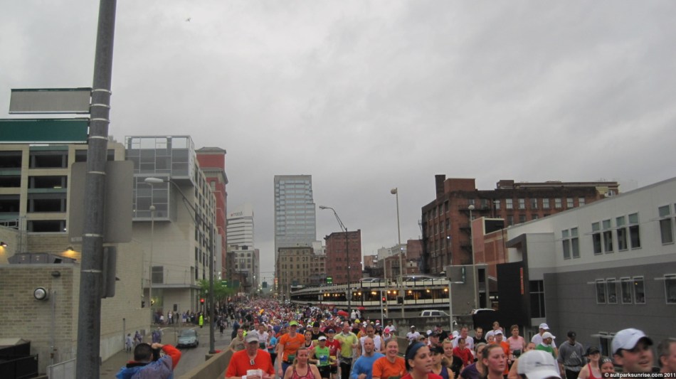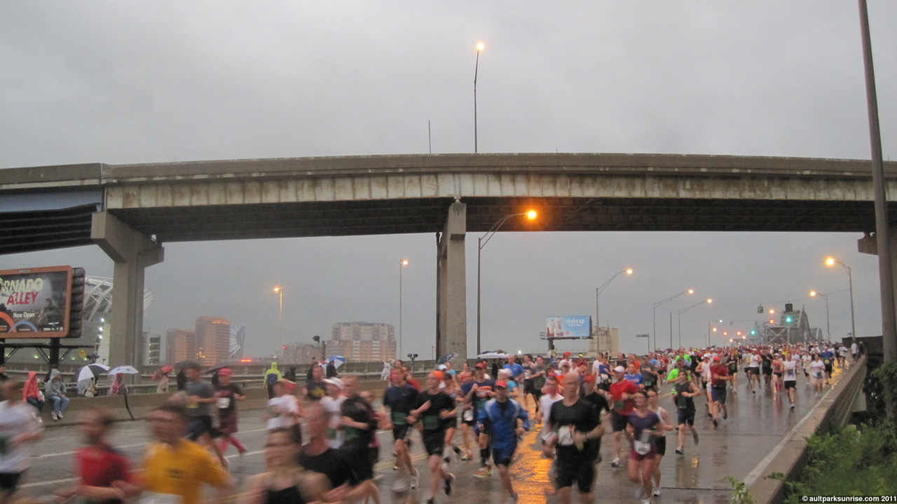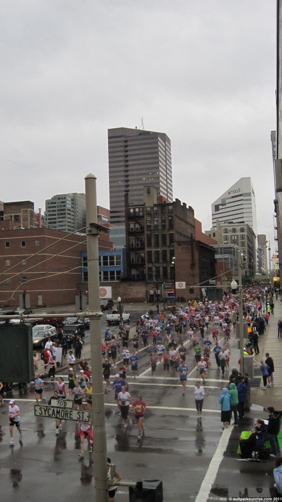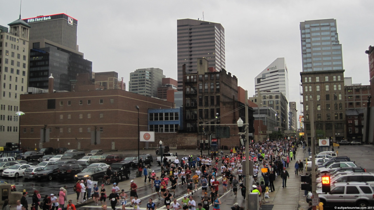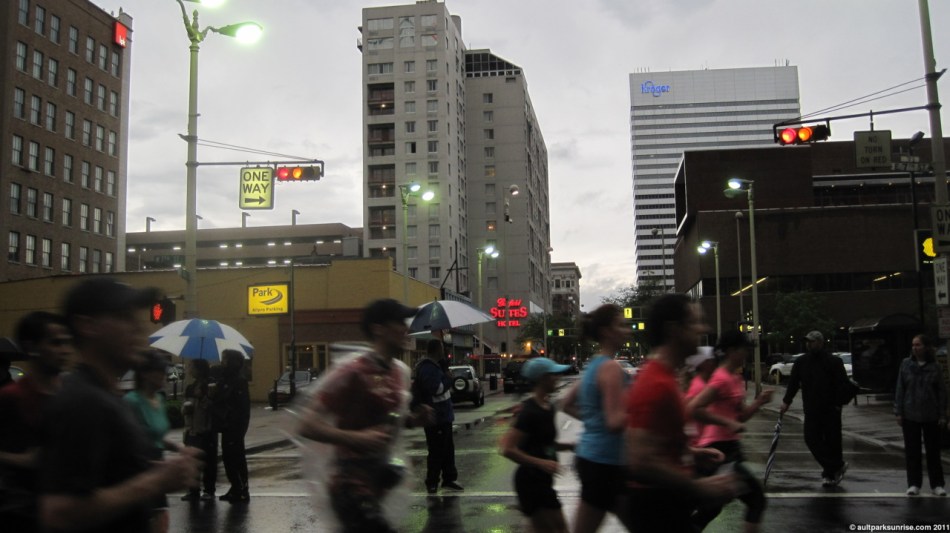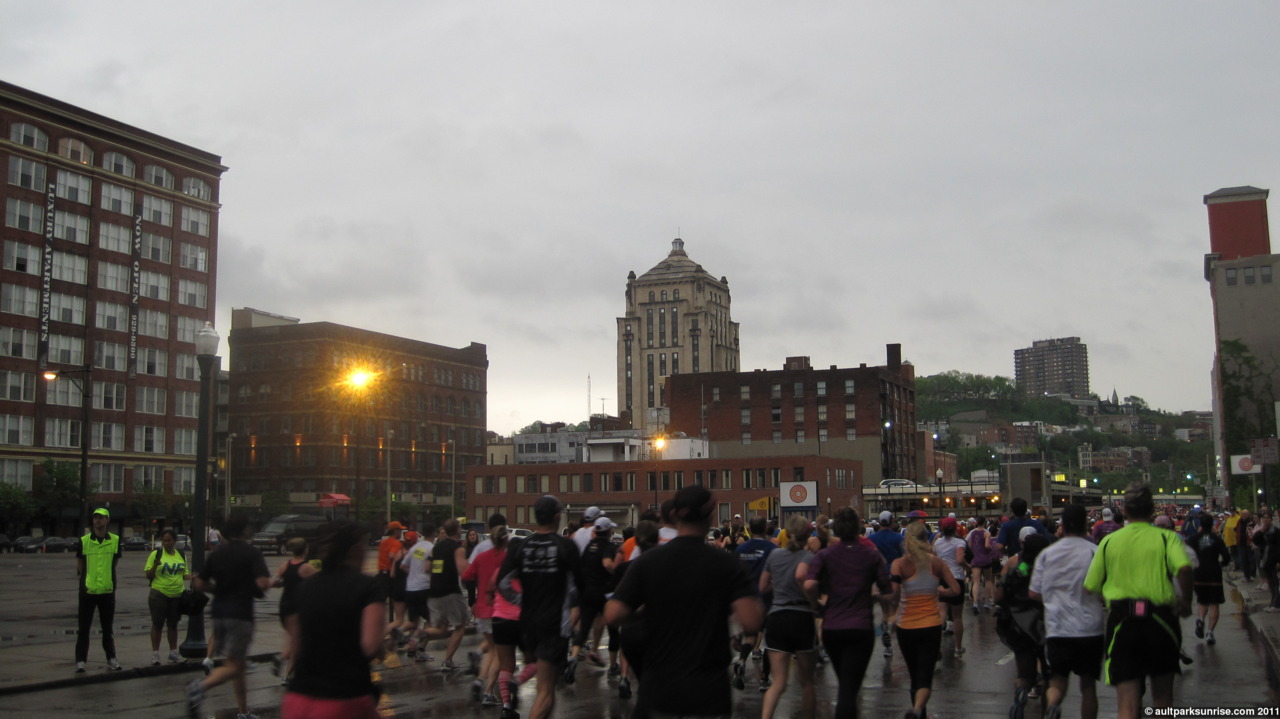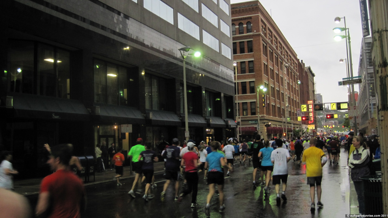 I realized that this morning would be Sunrise 20, a highly appropriate halfway point on the way to 40 sunrises! I had grandeur visions of seeing the sun rise 15 minutes after the race started (did I mention I’m only a spectator?) over the river. There would have been some great orange skies to be seen through the sky scrapers. This didn’t pan out, however, because the sky stayed a flat gray for the entire race. I still got some great pictures of some flying pig runners and old downtown buildings. (Click to continue if you’re on the front page –>)