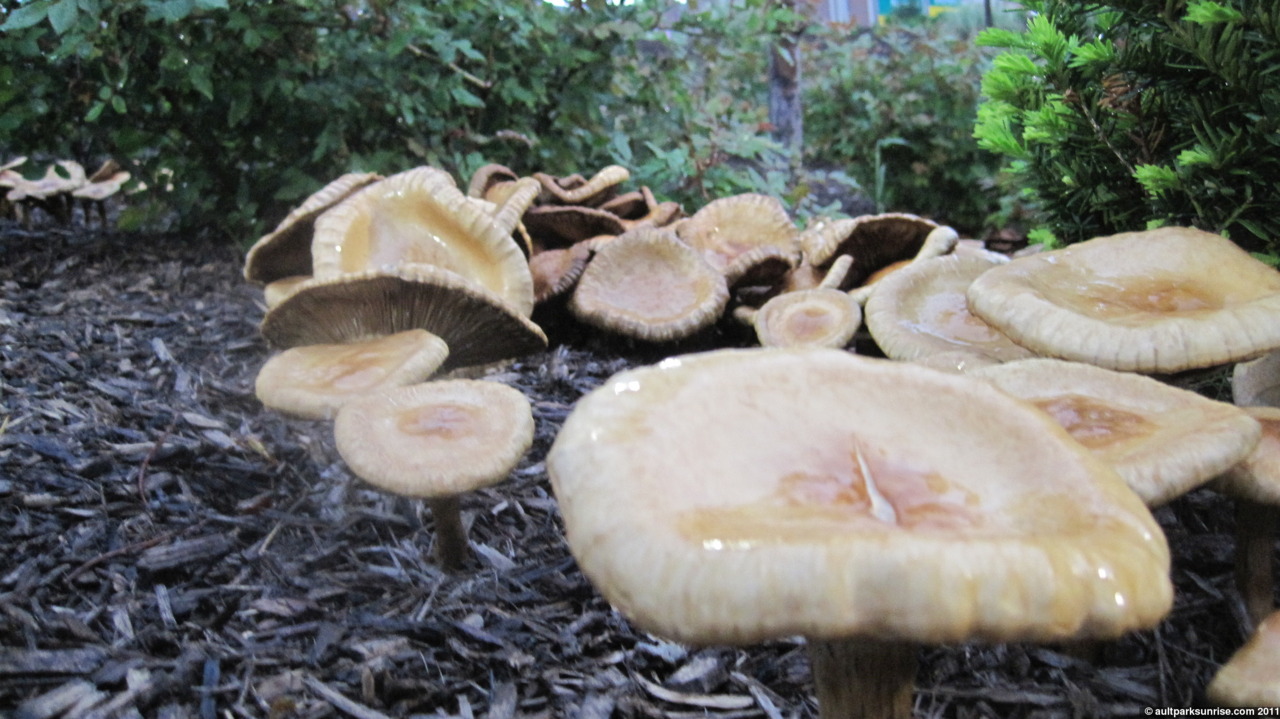 Lots and lots of mushrooms hangin’ out in the wet mulch!