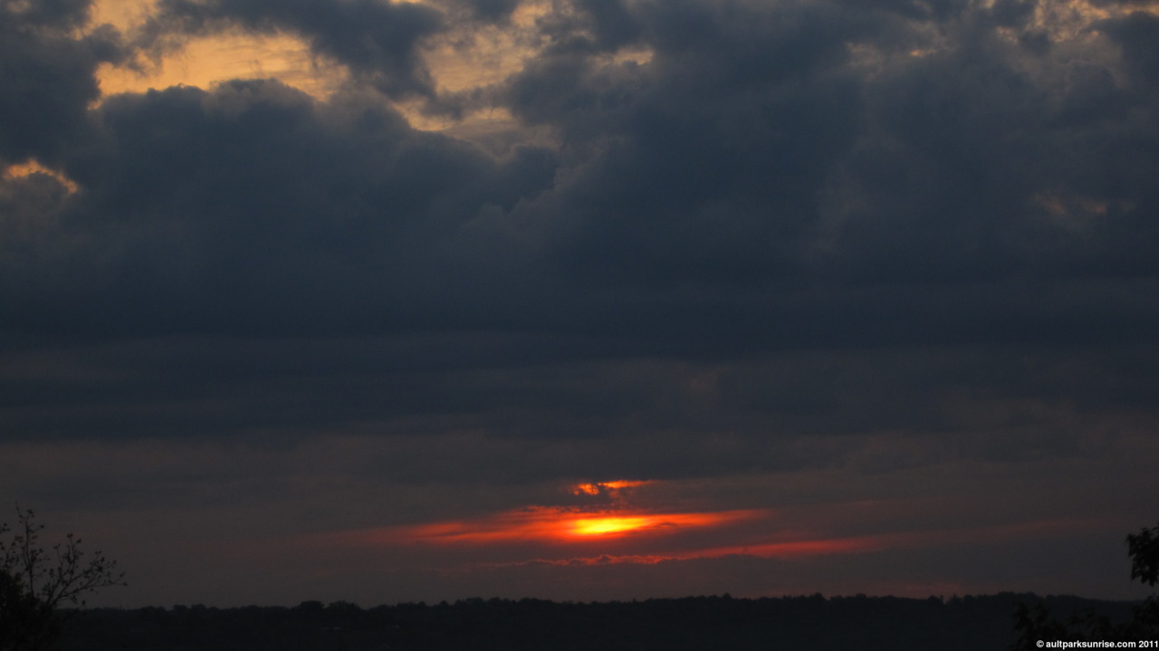 The sky was indeed filled with a low overcast cloud bank. The sun came up over the horizon and shined through the misty layers.