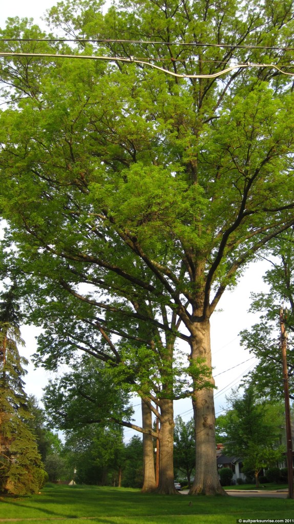 Just before leaving the neighborhood I noticed the set of old tall oaks that gracefully rise up into the sky. They are from the same period as the oaks in Alms Park – wide bases and tall healthy growth. A wonderful side effect of exploring an old neighborhood.
