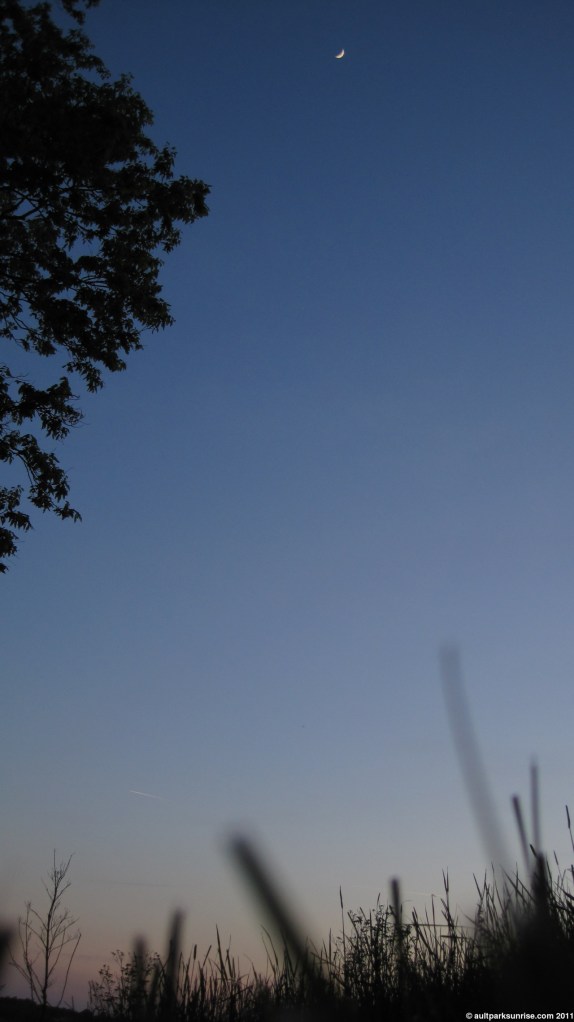 The moon was high in the sky with the crescent side lit up and pointing towards the sunset.