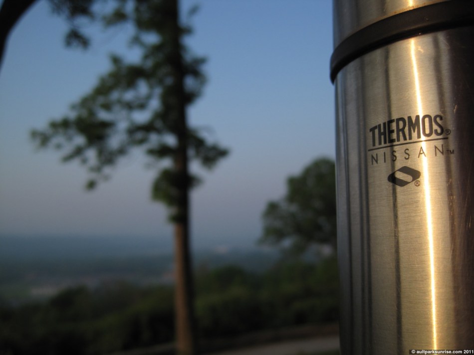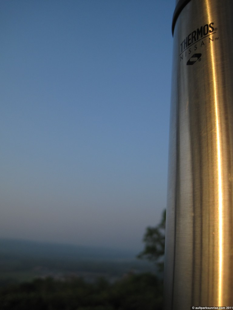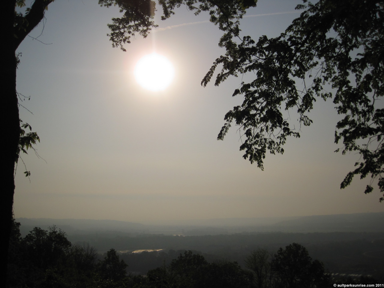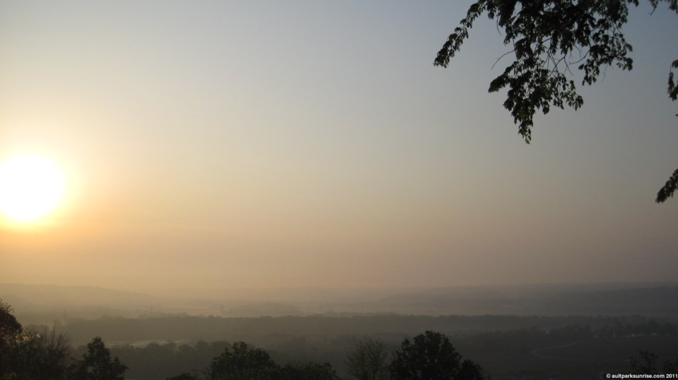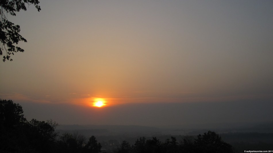 When I left our apartment this morning, the first thing that hit me was how the “thunderstorm” that was expected last night at 2am never showed up. The air was still thick and wet, something I hoped would go away as the expected front cleaned out the humidity this morning. There was a bit of a haze, but the atmosphere was clear of clouds for the most part giving the air a vibrant feel to it. I wouldn’t call it a fog because you couldn’t see any clouds manifest themselves from the overlook, but the entire valley (and the sun) had a visibility that seemed to stop abruptly about 4 miles away.