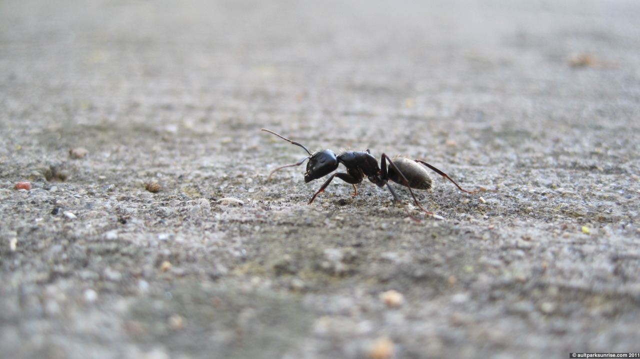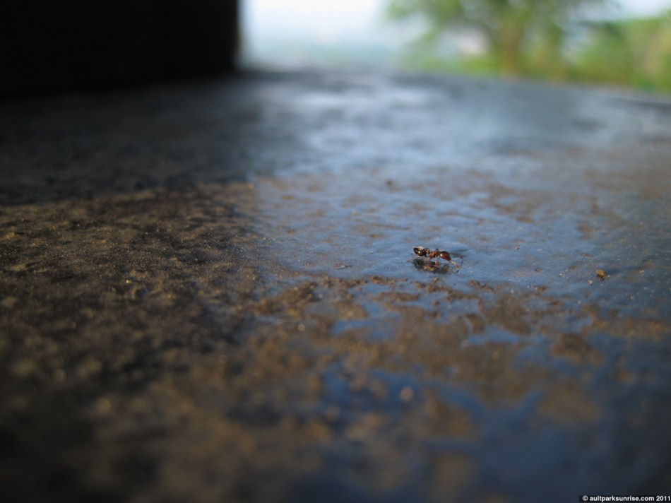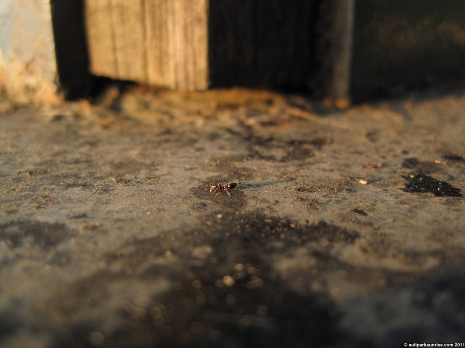 They filed out in their single file line and led me across the patio where they all hopped up on a fallen leaf into a small bush. I checked back 20 minutes later and there were hardly any ants in the line, let alone outside the entrance. It appears I witnessed the morning rush hour 🙂 Taking the ant pictures was kind of hilarious to me. I kind of felt like a “focus trapper”. What I mean is that my camera is an “auto-focus” type. I can certainly guide it, but in the end it makes up its own mind. So what I had to do with these quick ants is set the camera to “standby” ahead of time, causing it to focus on a specific piece of the foreground. I had to time it so that an ant would run into this foreground at some point in the near future, when I would take my shot. It worked out for several pictures.