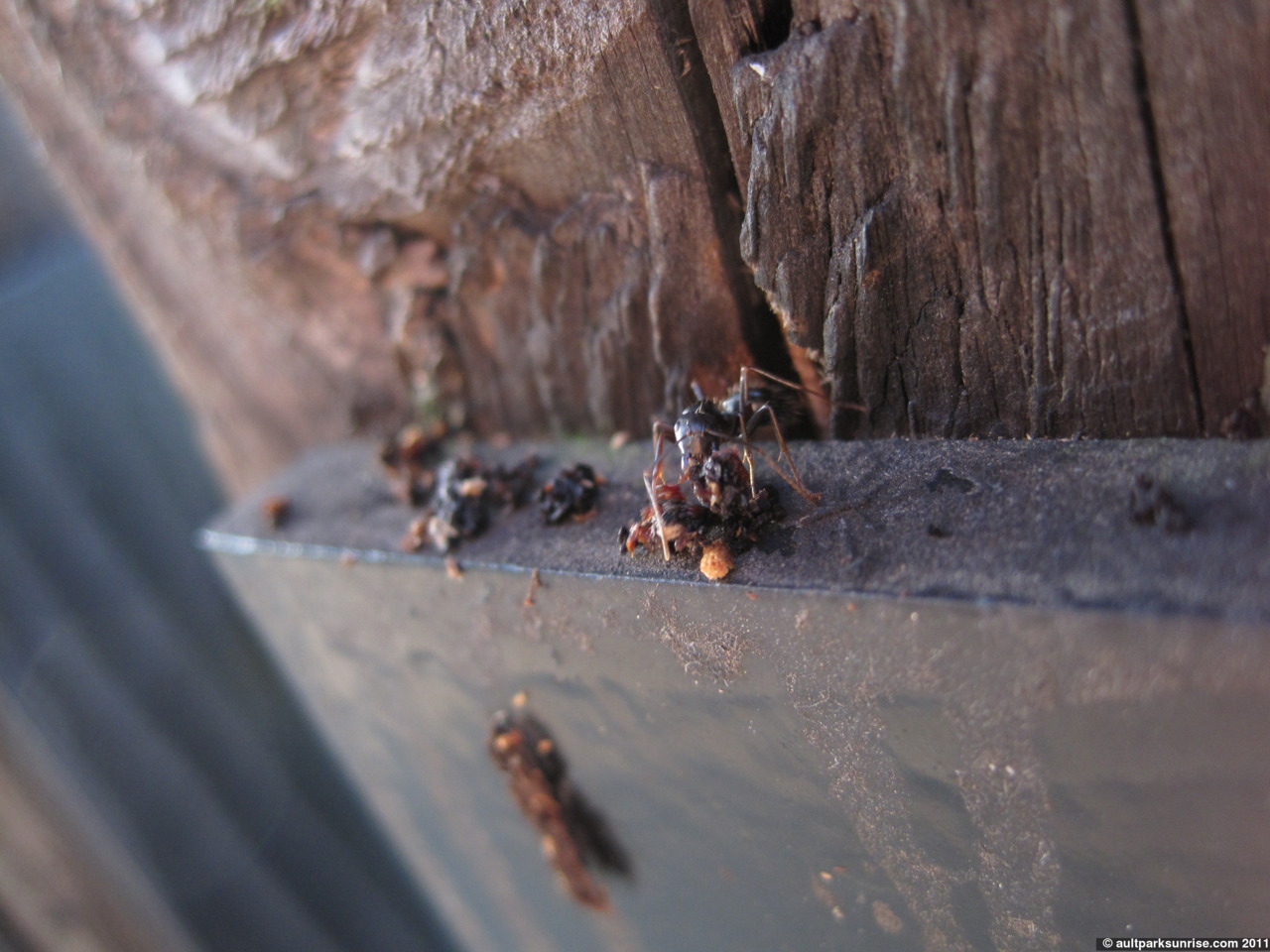 On the next beam over I saw some movement from a bigger species of ant. A species I know so well. The midwest carpenter ant. My parent’s home that I grew up in was made mostly of wood and brick and we battled constantly against their yearly invasions. Aside from being a residential nuisance, they are fascinating to watch because they can become so large. Their soldier caste have these giant heads and tower over the small forest ant species by several orders of magnitude. They are so large, in fact, that I rarely see them mess around with the other small ant species (I HAVE IDENTIFIED THEM AS APHID FARMERS); they seem to get along and stay out of each other’s way. The carpenter ants were burrowing into a small hole between the wooden post and the metal base, making neat piles of tiny pieces of wet mulch. Earlier in the morning while I was sitting on the bench I saw something fall down from the canopies above me and land by my foot. A spider carcass. At the time I couldn’t come up with an explanation, but now it appears that the carpenter ants are doing some spring cleaning and were likely throwing out their waste from a nest entrance up on top of the overlook.