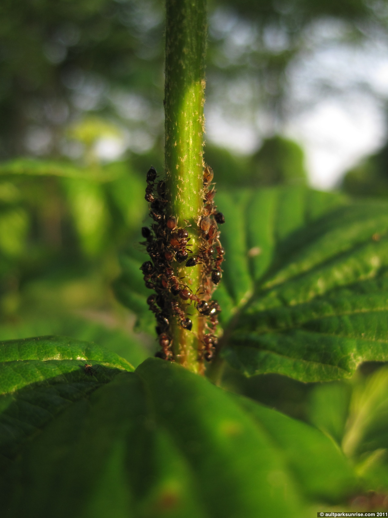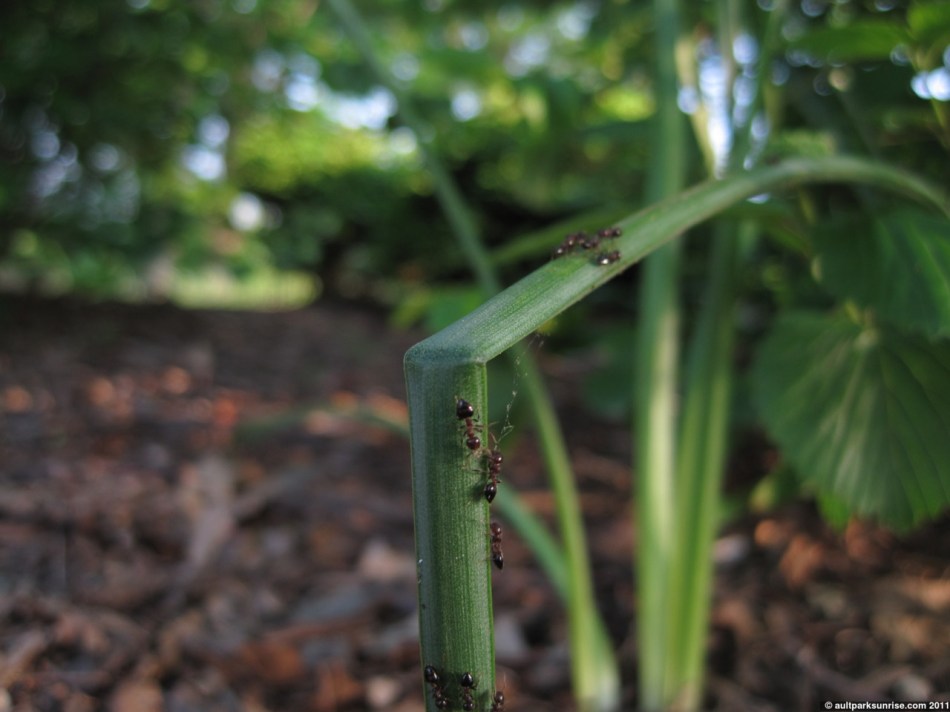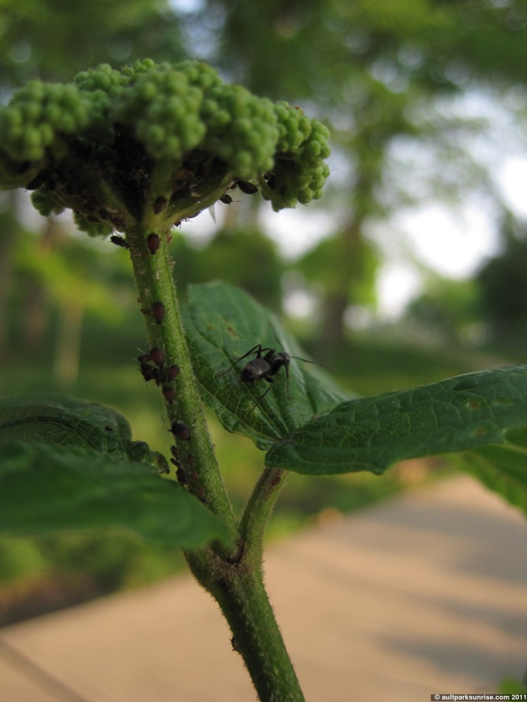 The ants are known as “Aphid Herders”. What happens is that the ants protect the aphids from the ladybugs, who are actually great hunters. The aphids cluster together while the ants walk among them, cleaning them and milking them for “honey”, or sugar water that they excrete. The aphids feed on the plant by sucking water and juice from the stem. There were many ladybugs on the plant, no doubt attracted by the tens of clusters of aphids. The ants were bouncing back and forth between the several clusters of aphids, sometimes leaving the aphids alone to fend for themselves before returning after a little while.