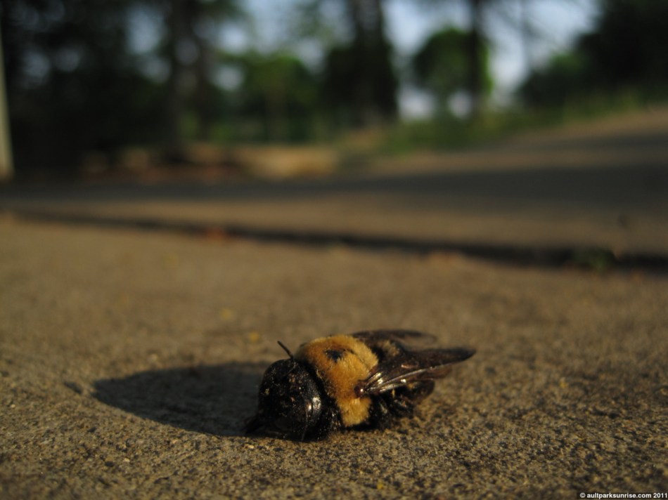 One thing that stuck out to me was how loud the bumblebees were. I typically don’t notice them in the moring, but today was different. I even heard, several times, a bumblebee crash down into the bush I was observing and noisily re-orient itself before flying out from the bush into the sky. One particular time I heard a loud buzzing followed by something hitting the patio 15 feet from me. I walked over to the patio and saw bumblebee lying on the ground, dead as a doornail. I then looked around and saw 4 other bumblebees, also dead, within 20 feet of the area. They had not been carried away by the local ants, yet, so they had to be fresh. I looked up and saw that there were several bumblebees in the middle of what at first I thought was a mating ritual, but as it turns out (I think) was some kind of mating or territorial fight. The bees would engage in the air, about 30 feet above me, and twirl around and twist as they fell towards the ground. The bees would disengage just before hitting the overlook or the cement, and fly after each other, tumbling into bushes and flipping into the trees. I imagine that they are fighting for total dominance over a female, I can’t imagine fighting that hard over nothing more than territory. For whatever reason they have chosen the overlook as their dueling grounds, explaining the five carcasses I found in the area.