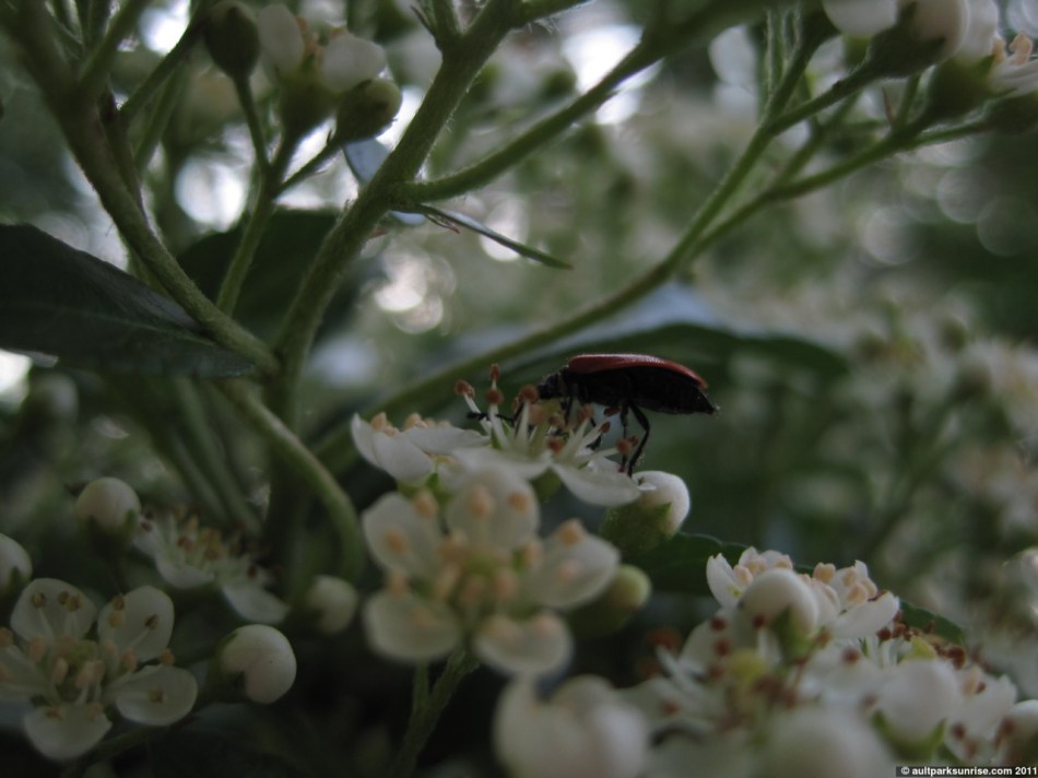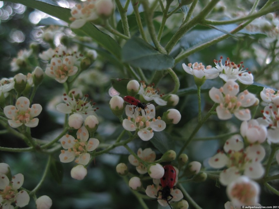 As the sun became more intense (by this time it would have been around 8:00am, 1.5 hours after sunrise and time for me to get to work!) I stopped by to take some final pictures of another blooming bush nearby. This bush had several red beetles on it that were not ladybugs, or at least not the familiar round ladybugs we are all used to. There were more spiders on this bush as well.