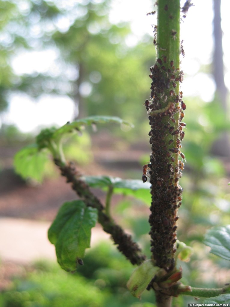 Great shot of the aphids. Look at how many of them there are! There’s even a caterpillar in the mix. I prefer them out here over in my herb garden, where they wrecked havoc last year against the young plants 😦