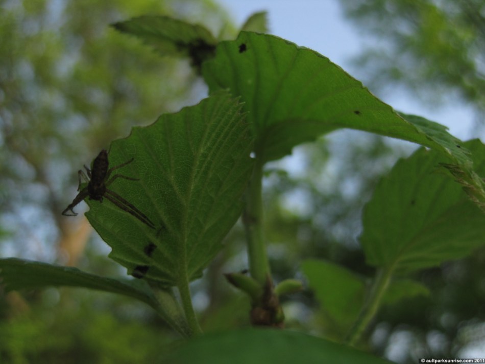 One important lesson, of course, is that where there are ants, aphids, and ladybugs, there are also spiders. There were several species of spiders that I found on the bush, probably many more that were too well hidden. One species had a small web laid across a leaf, the other two were waiting on the underside of the leaves for an unsuspecting victim.