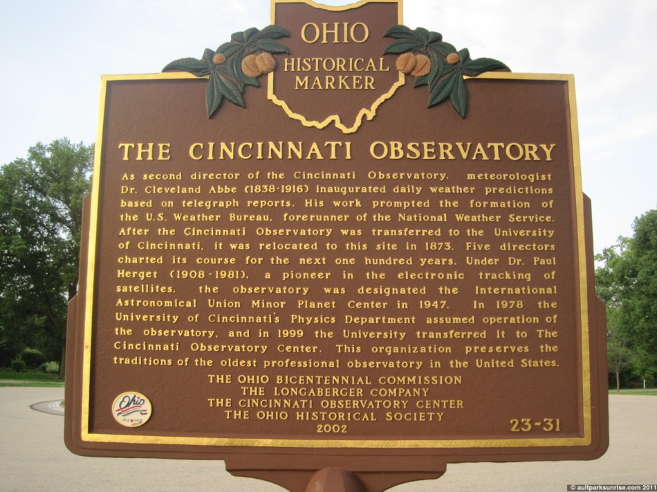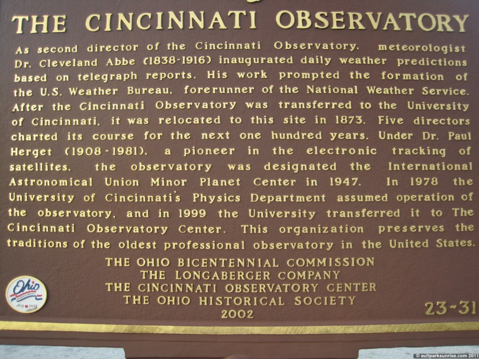 I also realized that there is actually a back to the historic plaque out in front of the observatory. The plaque describes the founding of the National Weather Service. Now that I know that there are two sides to these plaques, I’m going to have to go find all the ones I’ve seen around Cincinnati and see what I’ve been missing!