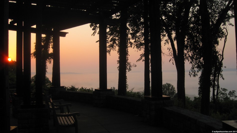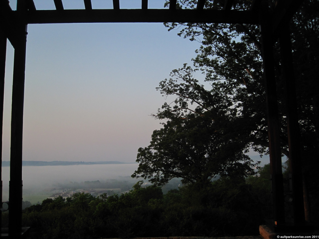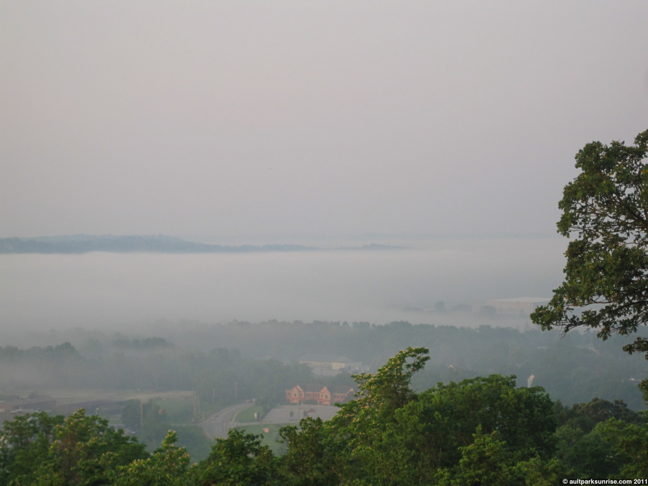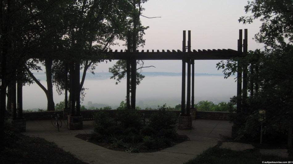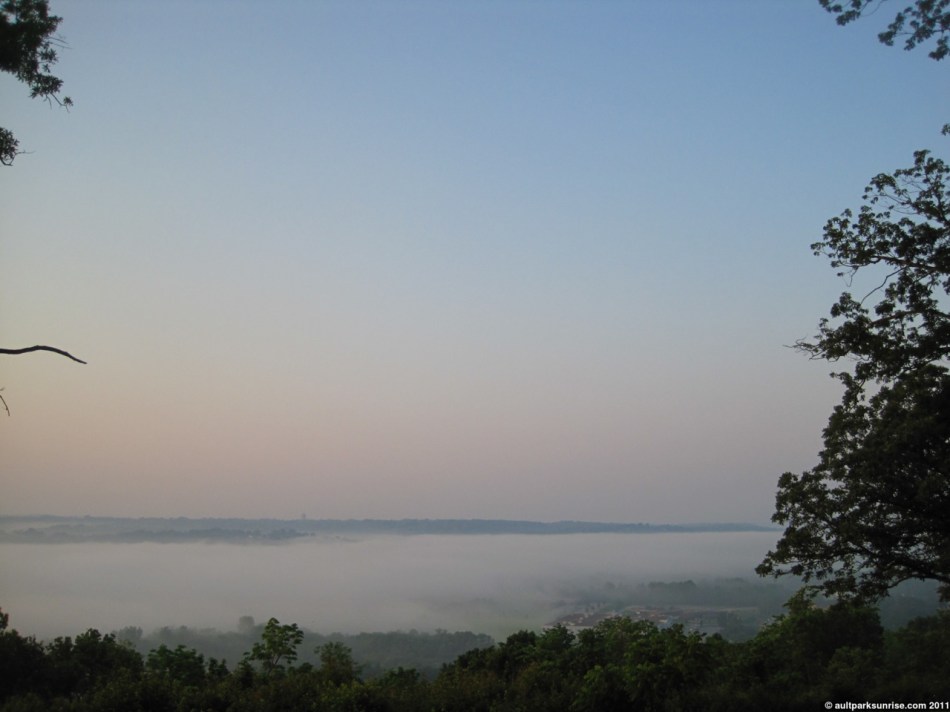 Looking west towards Lunken Airfield through the overlook. We can see the fog beginning to retreat in the foreground below.