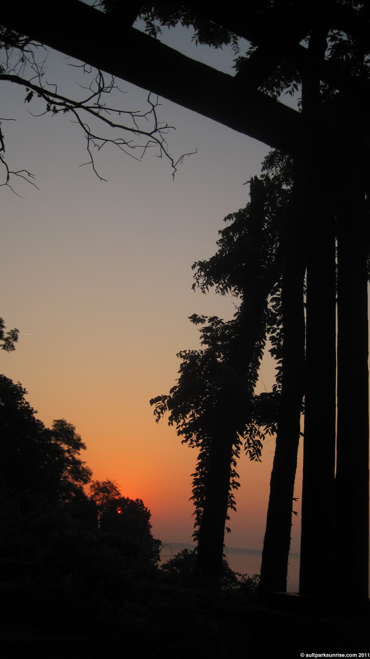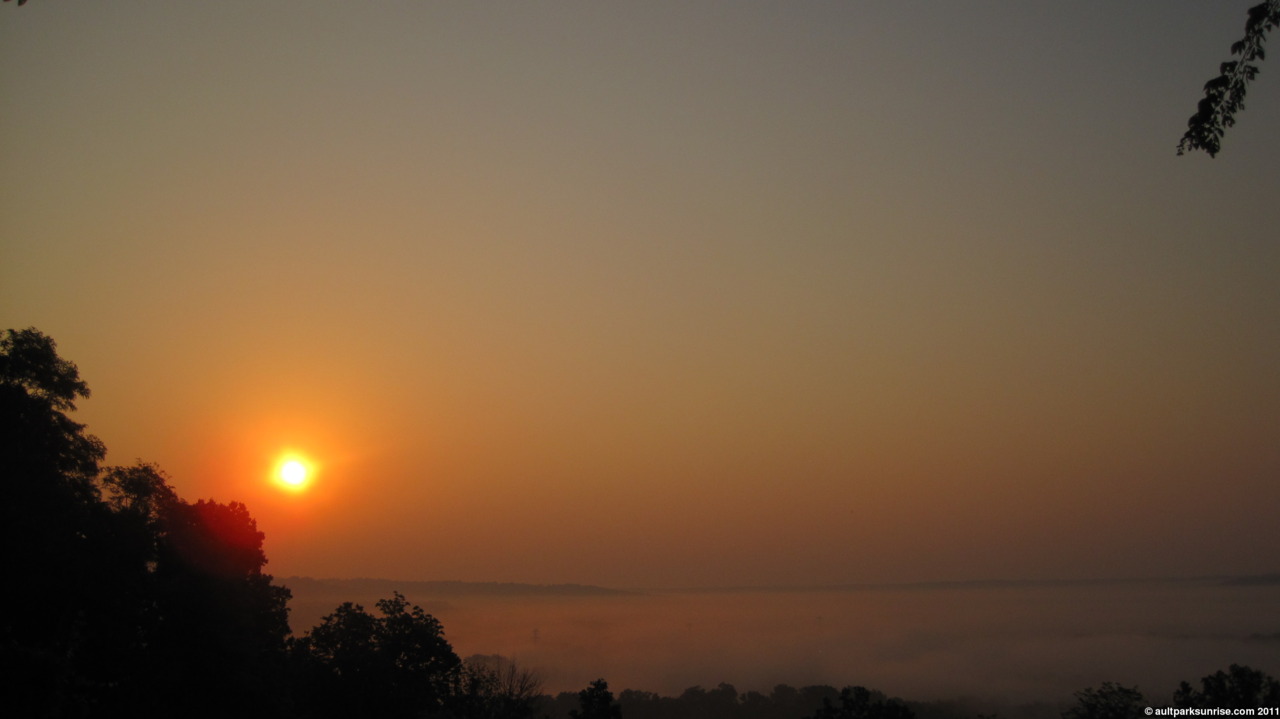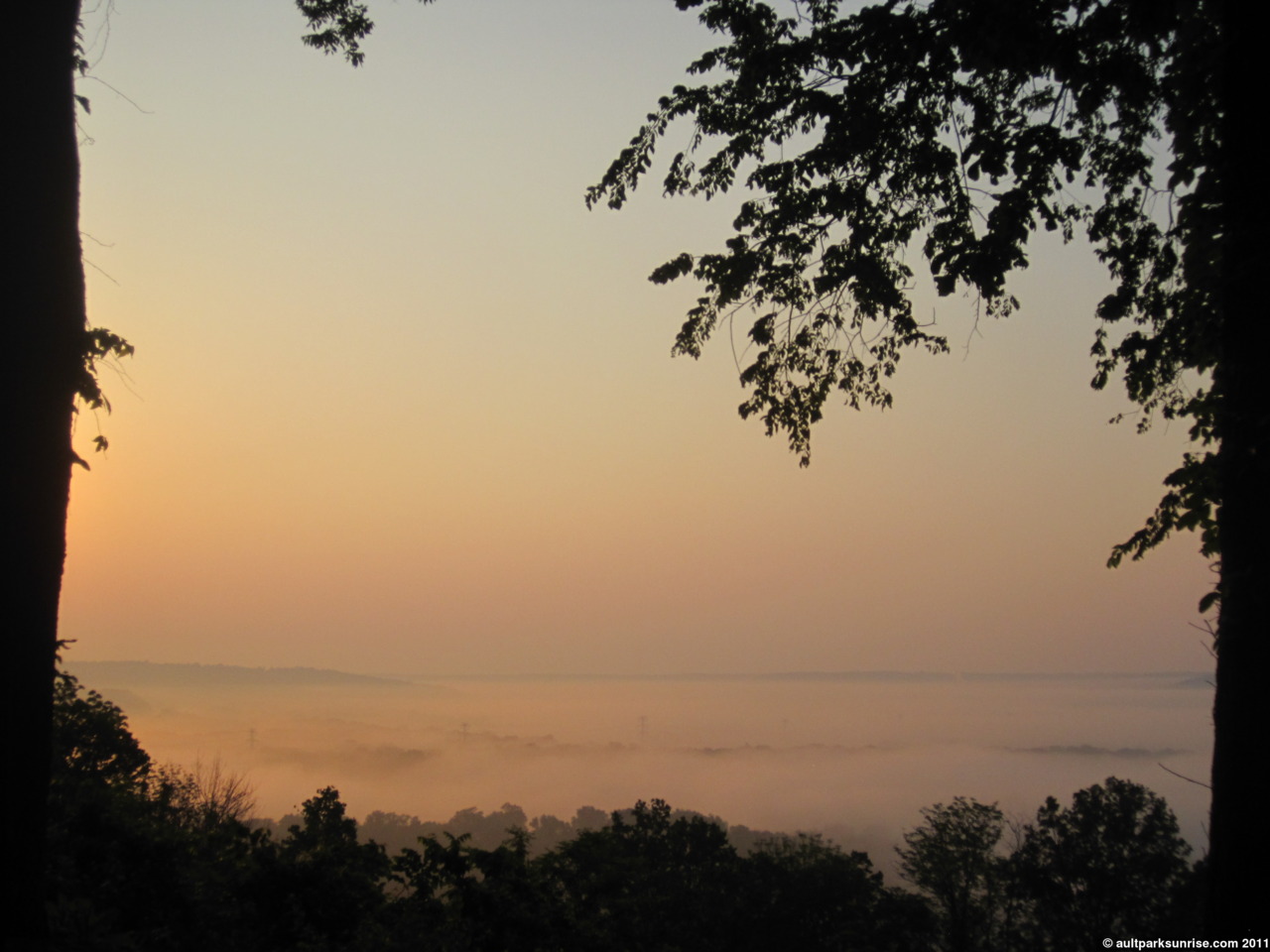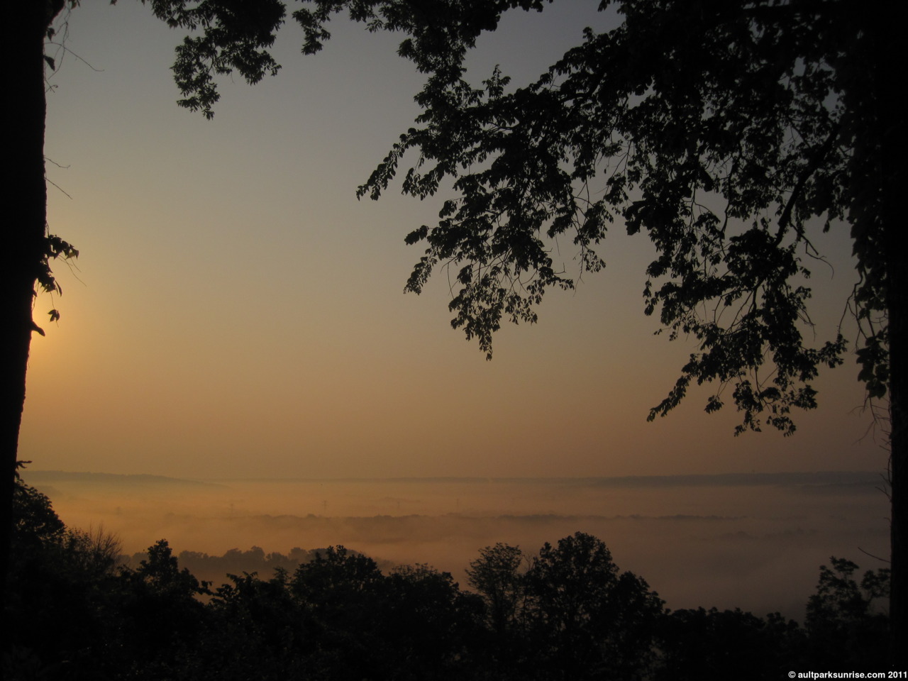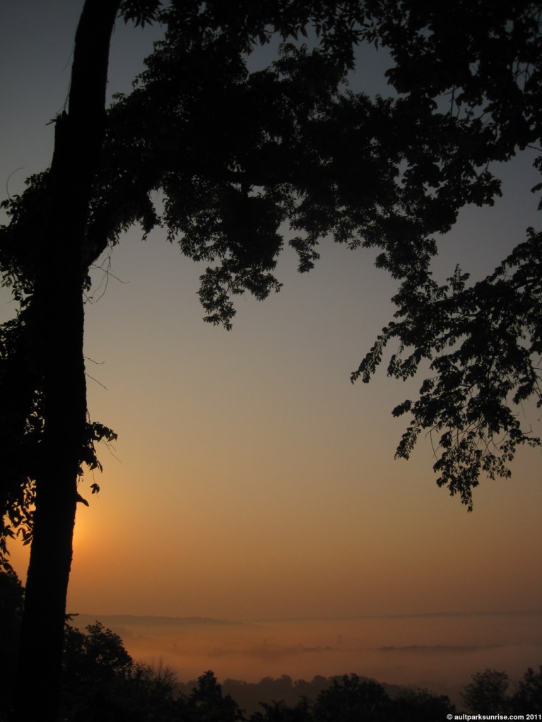 A final shot of the sunrise over the foggy valley looking through the trees from the overlook.