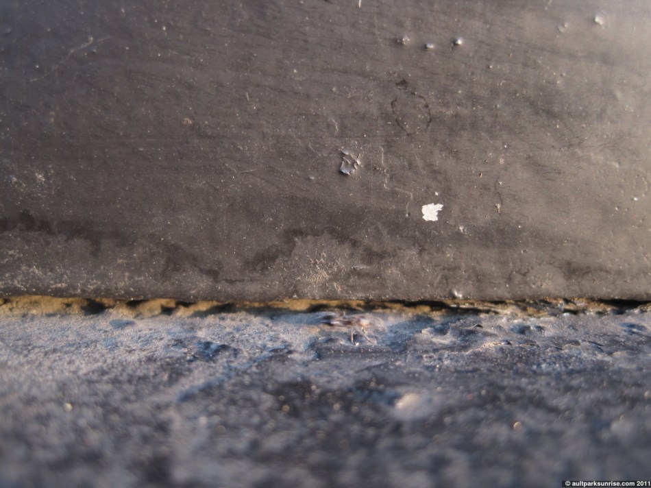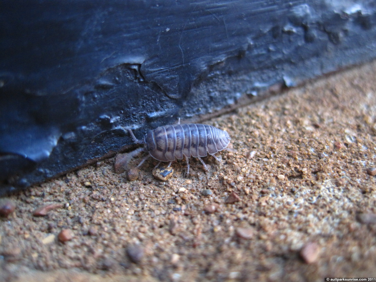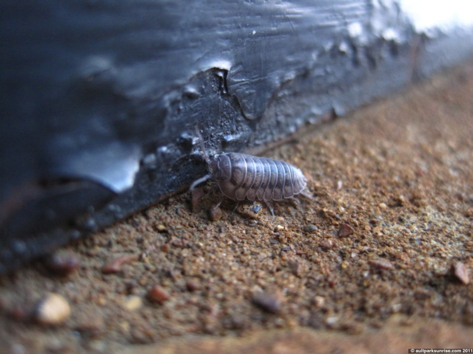 I stopped by one of the bases of the metal columns. There was a familiar entrance to the aphid herder’s nest as well as a few pillbugs hanging around. One in particular was rather large and it had its attention held by something on the wood base. His antennae were flicking around wildly but it provided an easy opportunity for me to get a macro shot or two.