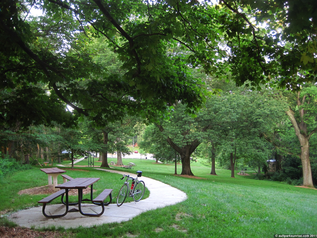 After hanging out at the overlook for a few minutes, I wondered what the lower auxiliary part of the park was up to on this fine morning. The auxiliary section of the park branches off from the main road just after the entrance to Alms Park. It is quiet and peaceful down there. The clearing is surrounded by thick forest and tall oak trees. There is a shelter, swing set, restroom, and several picnic tables. In the winter I can see down into Lunken Airfield but now that the leaves are hanging thick off the trees, I wasn’t sure that I’d have a view. I packed up the bike and did a quick jog on the way out of the park.