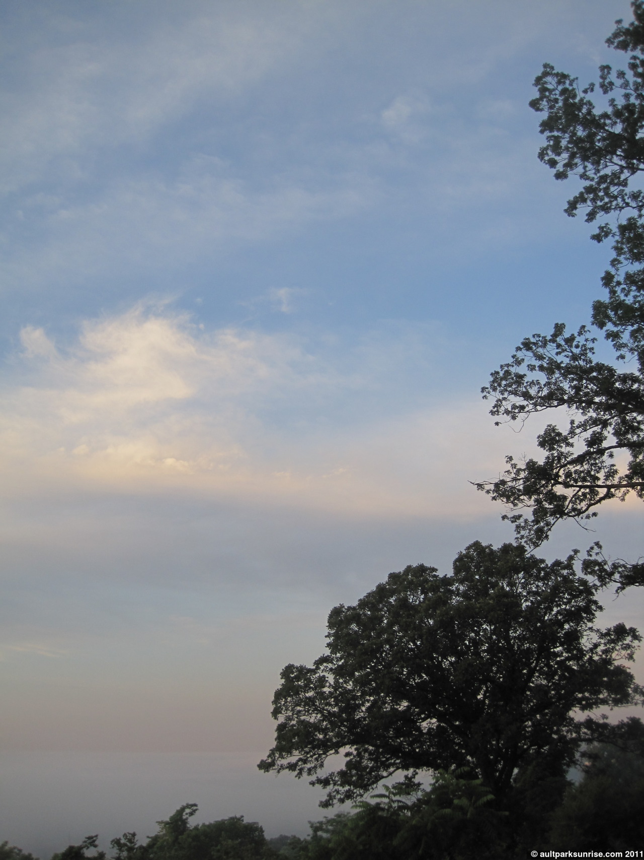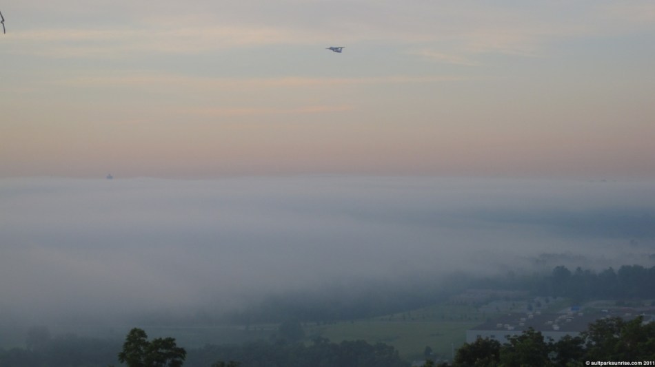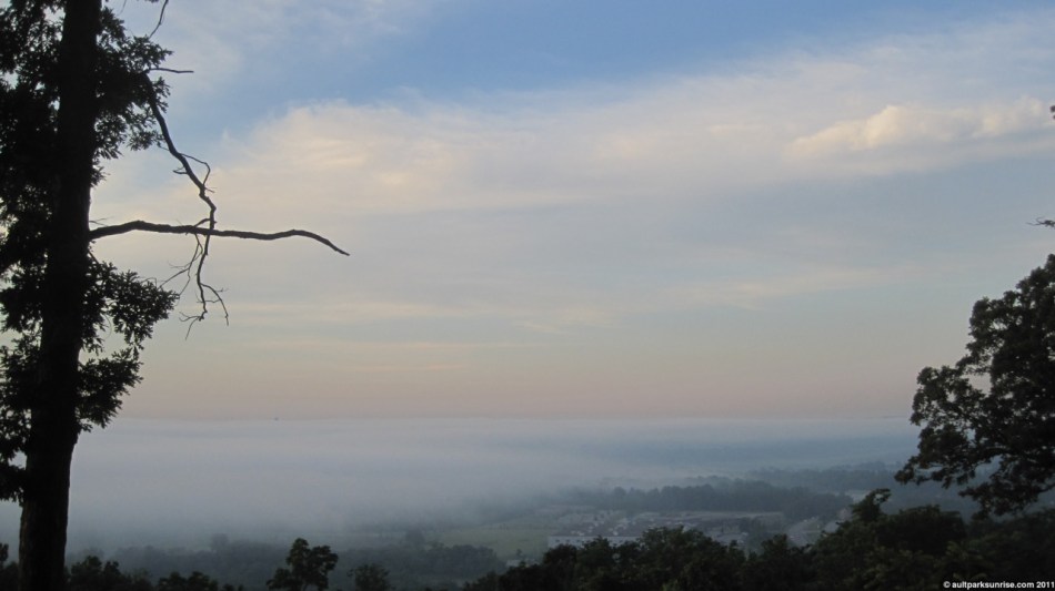 This morning would have been a great time to be at the Overlook 20 minutes before the sunrise. The haze was doing two main things to the sun light. First, it was scattering the rays throughout the sky, causing the twilight atmosphere to light up substantially prior to the sunrise. The second thing was that it was also blocking most of the orange / yellow light, so the early morning sky had a bright pink / purple-ish tint to it.