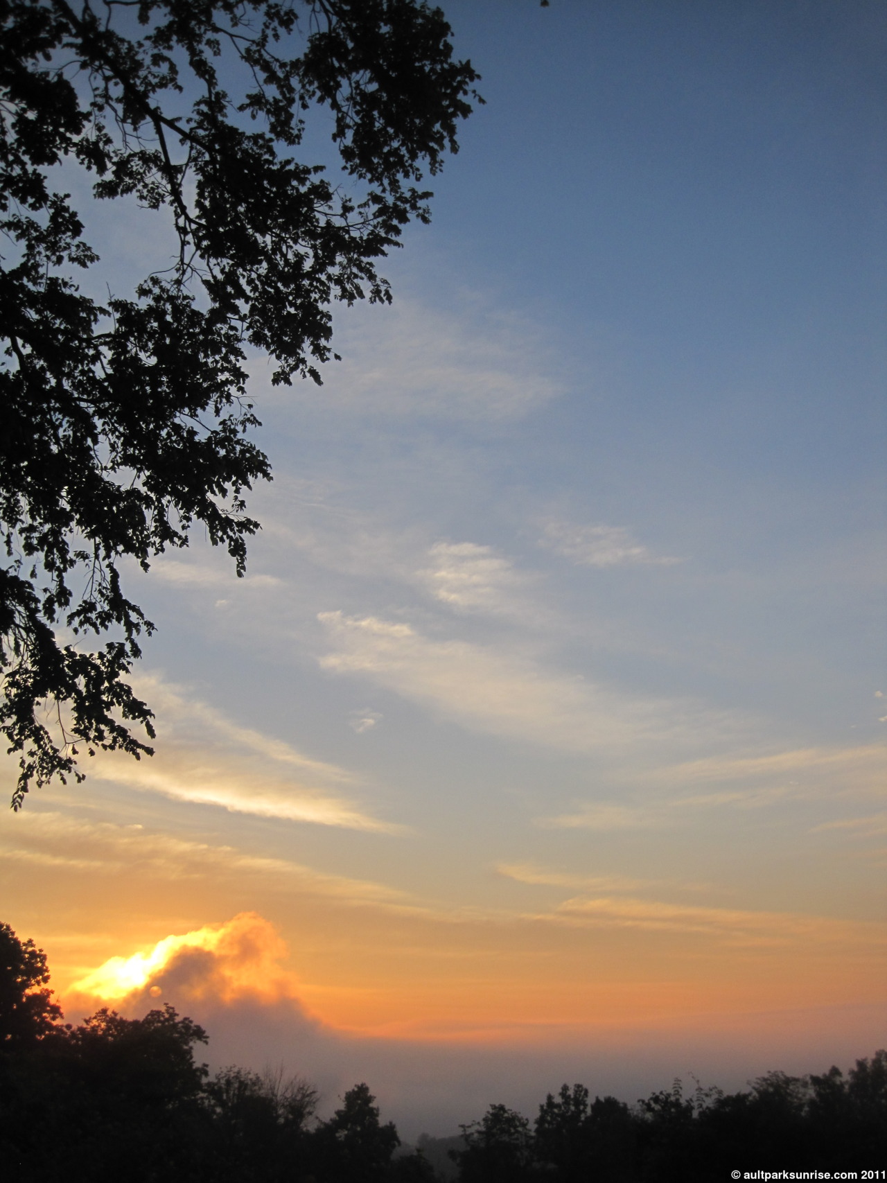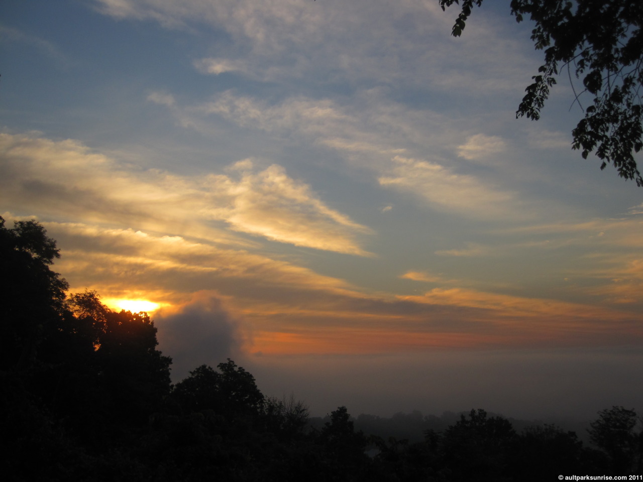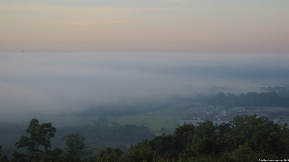 This morning’s sunrise was a bright one. It was one of the classic spring mornings where the fog is thick across the valley and the sky is mostly clear. I got up a bit late so I arrived at Heekin Overlook just as the sun was coming up. As I’ve mentioned previously I don’t actually have a direct view of the sunrise any more from Ault Park, due to how far to the left the sun has moved as we approach Summer Solstice. After June 21 the sun will revert back along the path to the east, eventually aligning once more with the Ault Park Pavilion. It is possible now that I think about it that the Pavilion might be aligned with the Winter Solstice (December 20-21), as that would be a point when the sun would be much further to the right (looking out at the Little Miami River Valley). I’ll have to make a mental note of that.