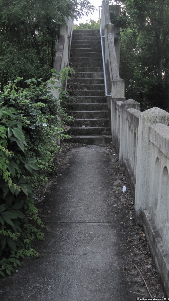 Across the street, a century+ old stone stairwell that is still in use. It takes a pedestrian over the railroad tracks and down to Linwood Park. Also a great way to access Armleder Park if you don’t mind picking up your bike.
