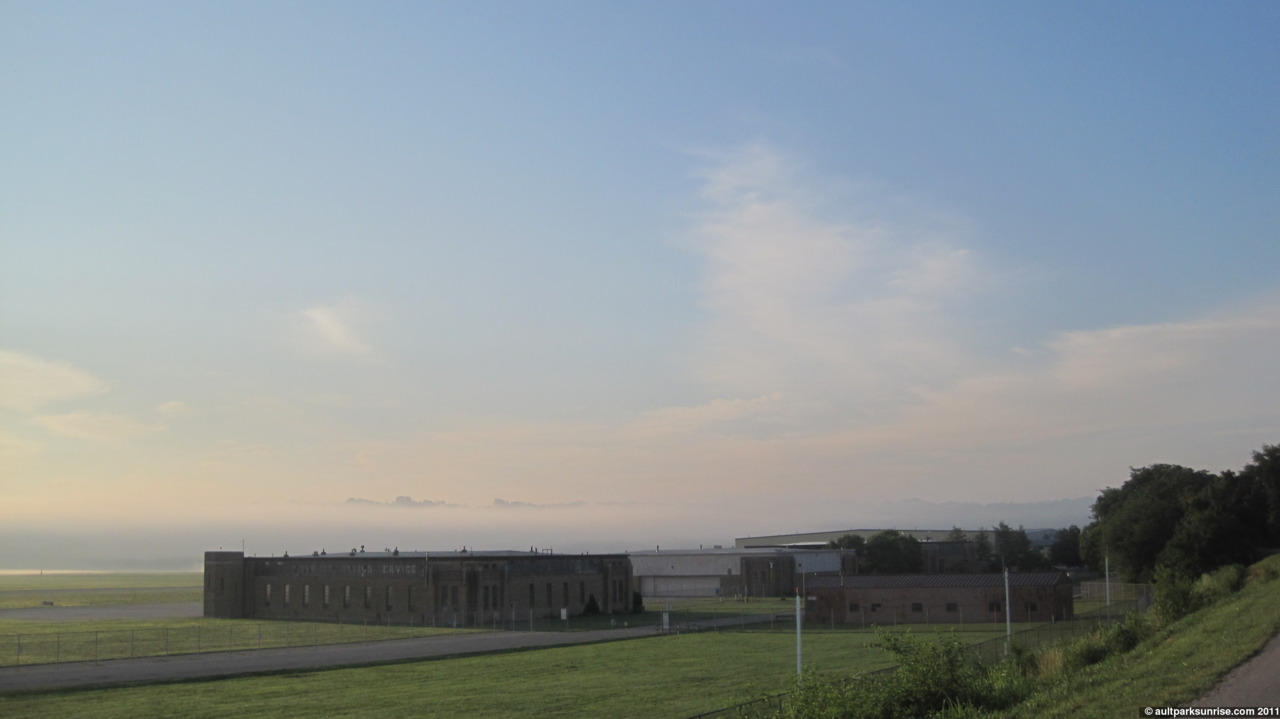 Looking South/East. These buildings are old. In the distance you can see the trees popping up through the fog. They are actually up on a levee that protects the airfield from the Little Miami River during flooding season.