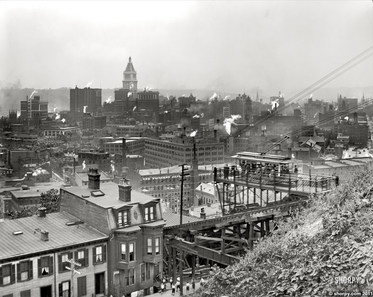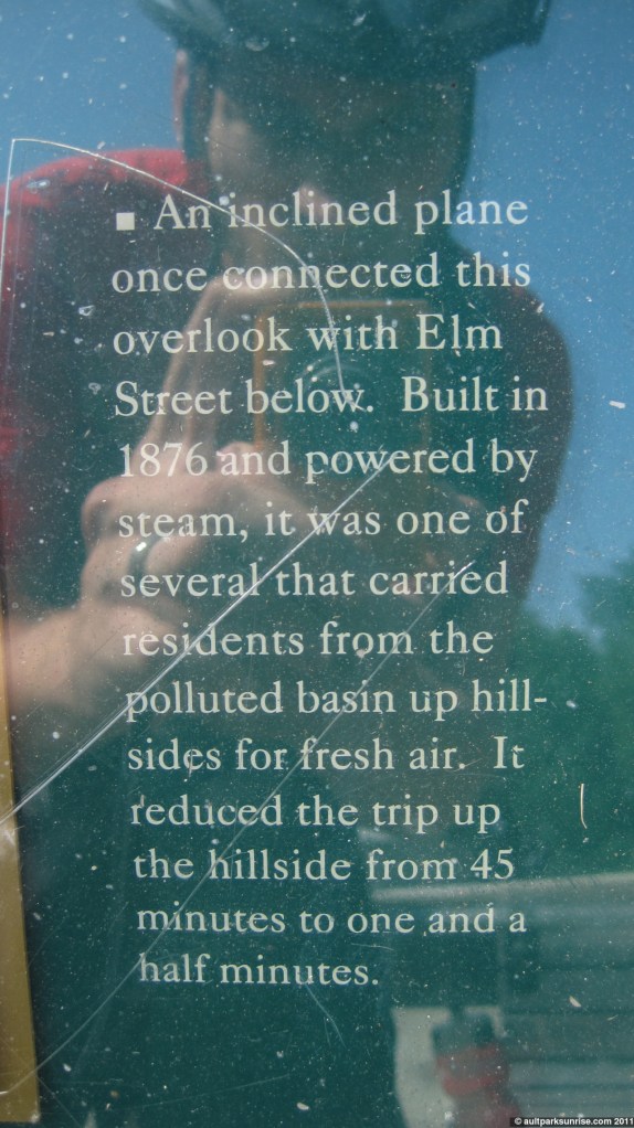 “An inclined plane once connected this overlook with Elm Street below. Built in 1876 and powered by steam, it was one of several that carried residents from the polluted basin up hill-sides for fresh air. It reduced the trip up the hillside from 45 minutes to one and a half minutes.”