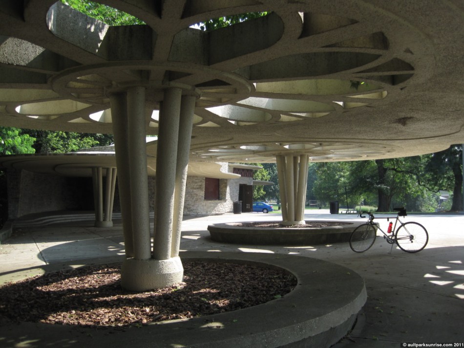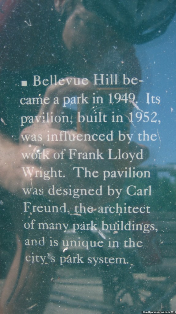 “Bellevue Hill became a park in 1949. Its pavilion, built in 1952, was influenced by the work of Frank Lloyd Wright. The pavilion was designed by Carl Fruend, the architect of many park buildings, and is unique in the city’s park system.”