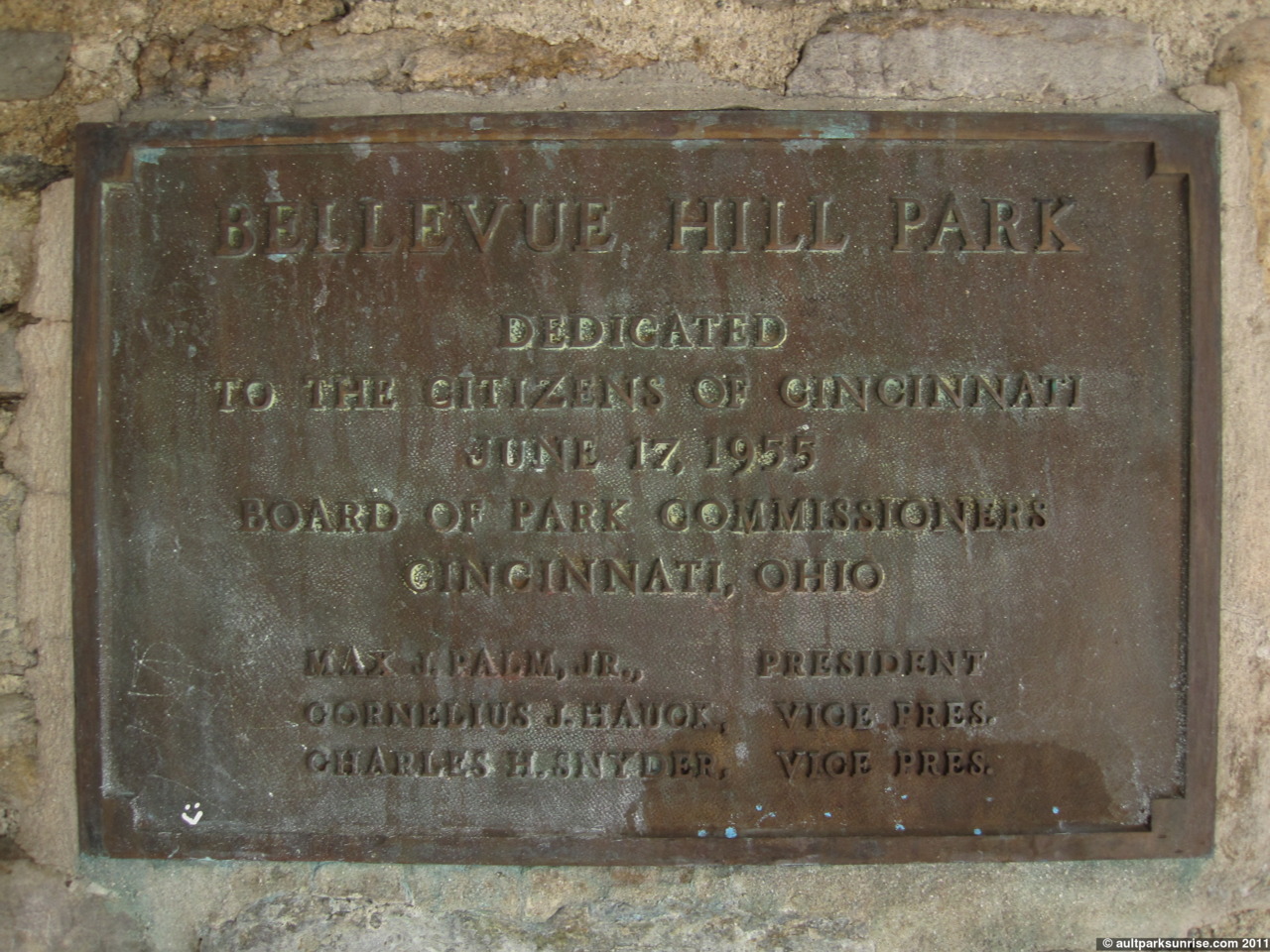 “Bellevue Hill Park Dedicated to the citizens of Cincinnati June 17 1955, Board of Park Commissioners Cincinnati Ohio. / Max J. Palm, Jr. President / Cornelius J. Hauck, Vice Pres. / Charles H. Snyder, Vice Pres.”