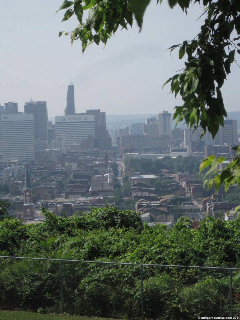 So I had a morning appointment on campus this morning and decided to commute by bike. It was hot and made for a great workout. When I got out of my appointment I decided to check out Bellevue Hill Park – a park that I love dearly for the view, but I hardly get around to visiting. The hills in Clifton are as bad, if not worse, than the hills in Eastern Cincinnati. Bellevue Hill Park sits part-way down the cliff side facing South towards downtown.