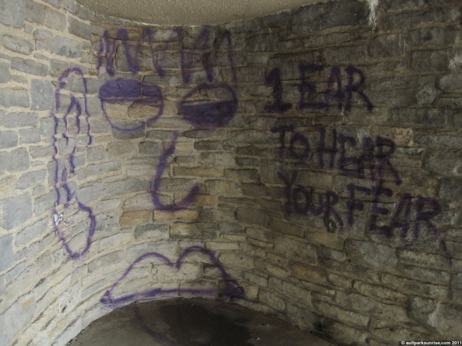 “1 ear to hear your fear”. Some interesting graffiti in the park. I have mixed feelings about this kind of thing. I’m going to have to go with thumbs down. If it looked like the person spent more than 5 minutes on it, maybe I’d change my mind, but for now it stands out simply as vandalism on the stone building in the park. I will, however, give some style points because this is actually in a very dark corner of the building. It is hardly noticeable unless you’re staring right at it.