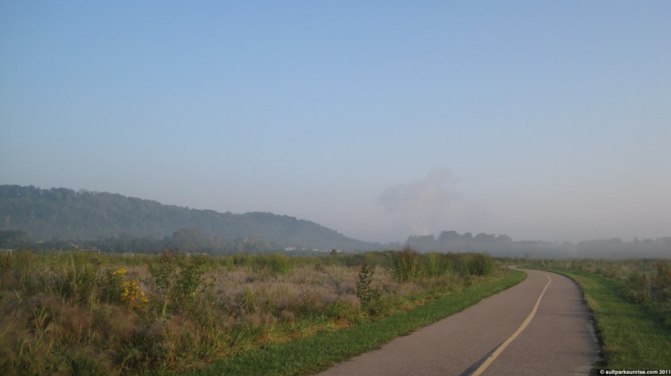 I took the opportunity to drop down into Armleder Park and ride through the prairie in the fog. It is amazing how fast the sun dissipates the moisture from the air. The fog rarely lasts longer than 25 minutes after sunrise. The river was flowing quietly and I climbed through the now lush 7-foot high river foliage where the packed mud trail has become a mere suggestion to emerge soaking wet on the other side. Cincinnati is in a northern-most tip of the “Sub-Tropical Humid” climate, the same climate that encompasses most of the South and South/East of the US. This fog is likely a crucial element in the ecology of the river basin plant life. The foliage is lush and green and it seems that almost daily there is a morning transfer of water from the river, up to the air, and then onto the plants as the sun warms the fog. I find it interesting that Armleder Park seems to always be foggy. The Little Miami River is smaller than the Ohio River, and yet the fog of the Ohio River rarely spills beyond the river’s banks. I wonder what’s up with that?