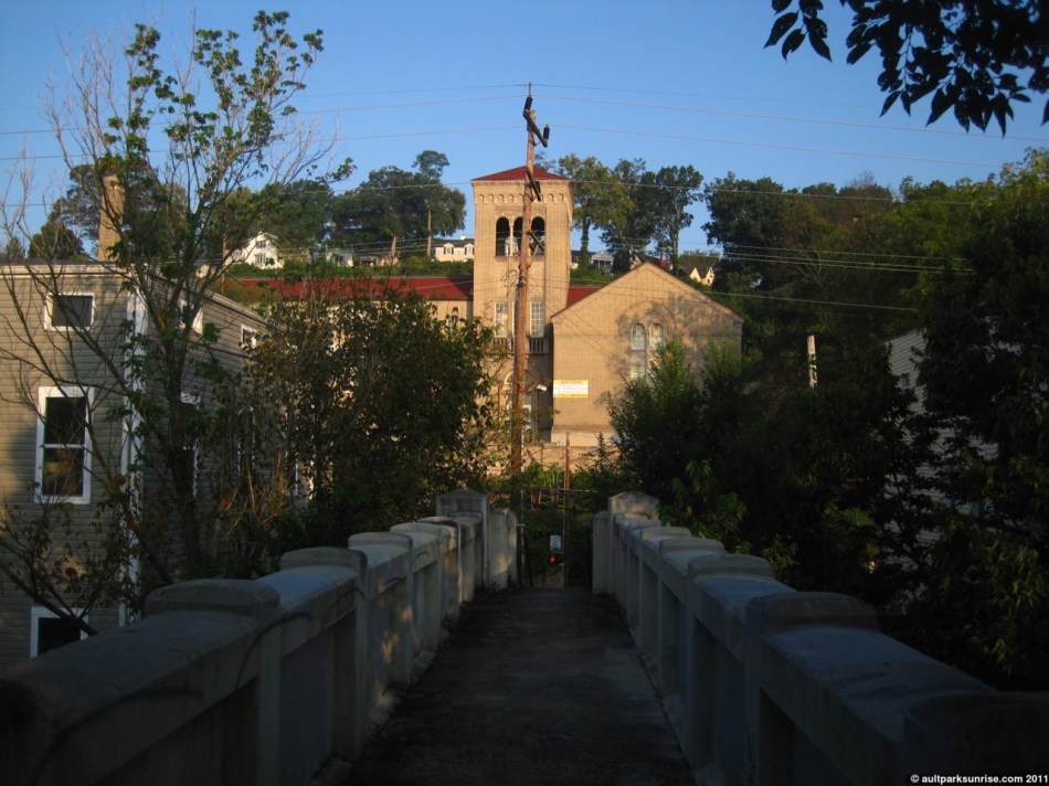 Just before climbing the hill back up to Ault Park, I have to cross over the stone pedestrian walkway. In the background we see the abandoned Linwood Public School.