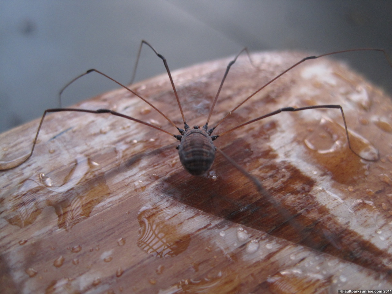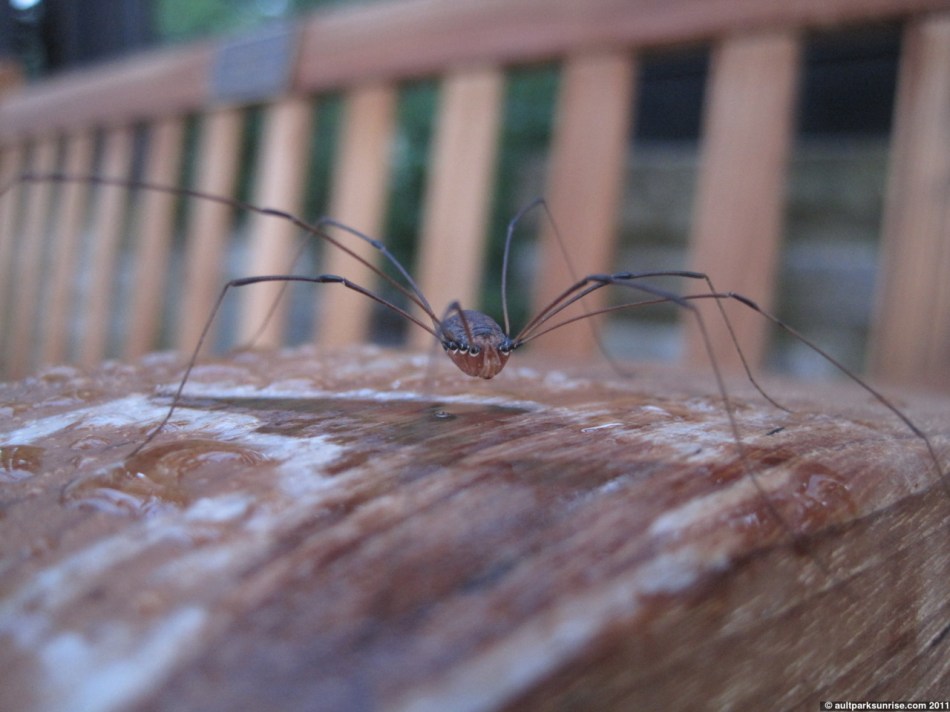 I found a friend on the bench. This is a harmless “Grand Daddy Longlegs”, an insect that is not actually a spider. Also known as a Harvestman.