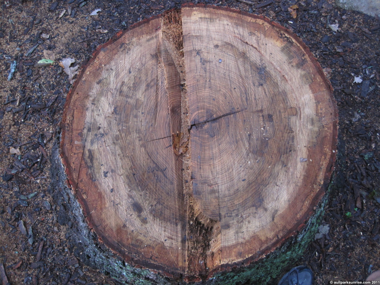 I counted between 89 and 92 rings. That’d place the age of this oak tree to within 10 years of Ault Park’s founding, seeing as how Ault Park recently celebrated its 100 year anniversary. One of the original trees planted by the first park crew of Ault Park.