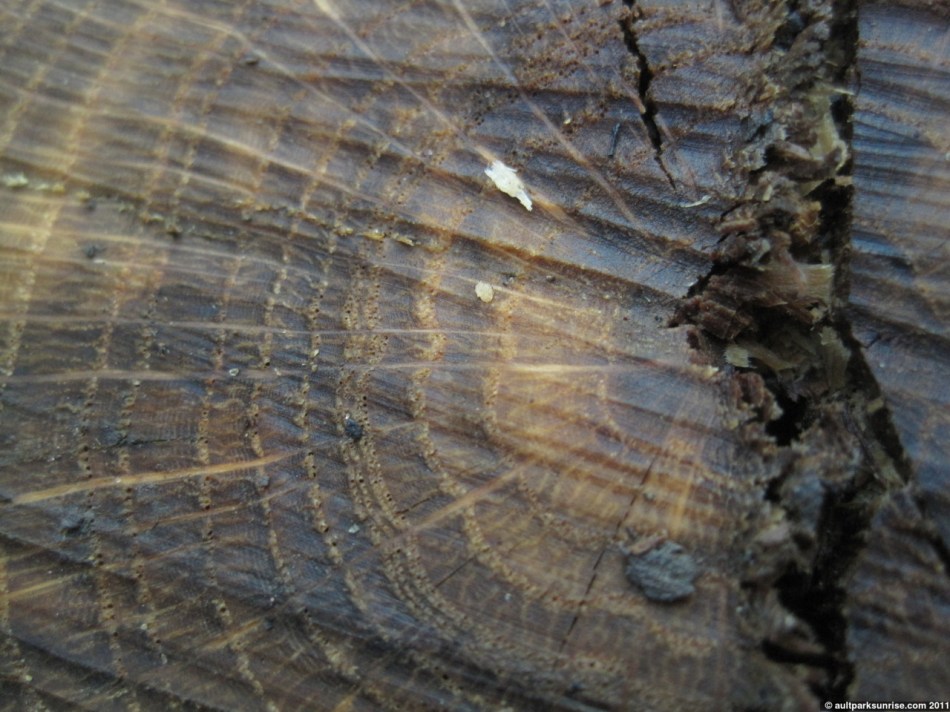 You can tell the years of plenty by the thick rings (lots of water for the tree’s circulation system to soak up) and the years of “drought” (less water = thin rings)