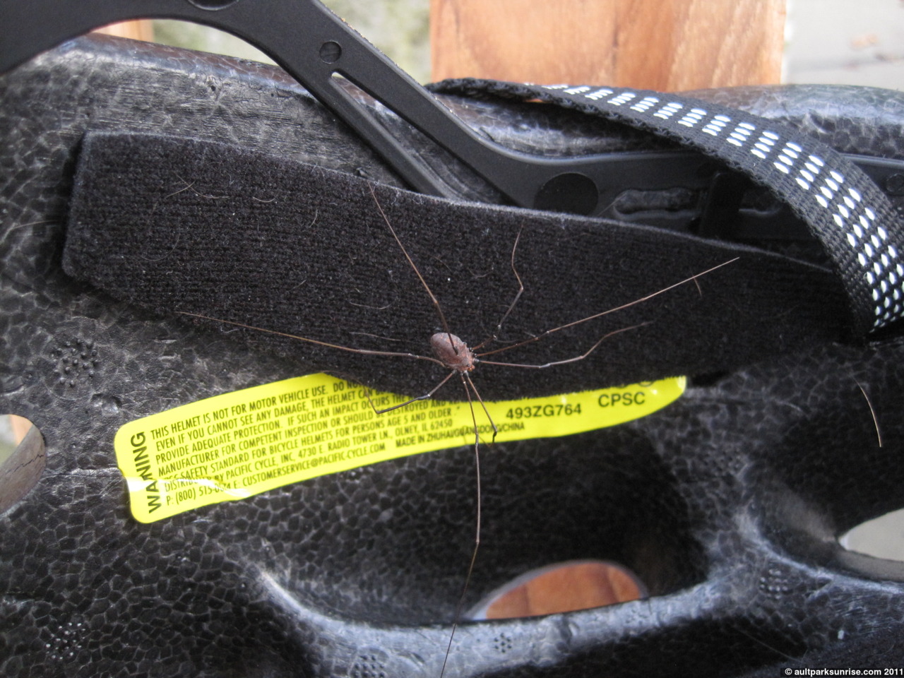 As I reach for my helmet, I start to brush away a “tuft” of hair that was just inside. Good thing I double checked, I wouldn’t want to hurt our friend Mr. Harvestman. I picked him up (they don’t bite, you know) and dropped him off in the bushes.