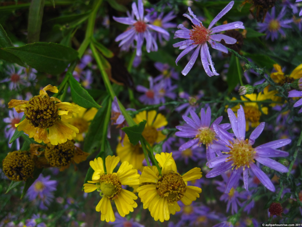 Some of the older blooms that are further along. Not sure what the violet flowers are but I like the color contrast.