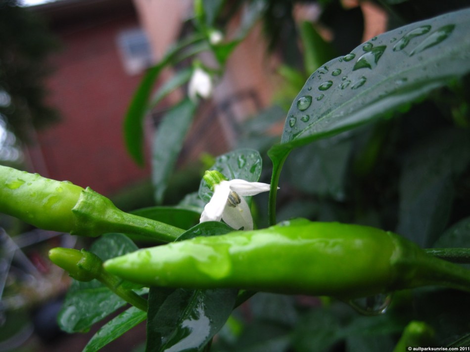 This is actually my chili plant given to me by my buddy Tom. A Puerto Rican Aji Caballero. It just *loves* this weather and it is exploding in new growth and flowers. No one told it that Autumn is coming. I’m trying to water it several times a day and feed it once a week just so I can hopefully harvest this round of peppers, which I think I’ll get at least 60 or more, before the first frost.