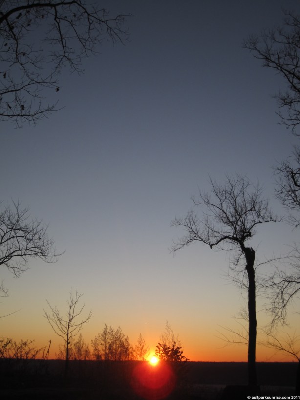 After yesterday’s sunrise fakeout, I was excited to head up to the park this morning for the first clear sunrise of the week. The forecast was pretty much dead on – low 20s (-5C) with clear skies. I climbed up to the park about 20 minutes early and poked around by the edge of the forest to try and find candidates for some silhouette pictures against the dawn sky. I found a couple, including the lone tree by the pavilion. There was actually a couple joggers in the park this morning putting up with the cold. I bundled myself up with the usual gear: thick gloves, hooded sweatshirt, insulated wind breaker pants, and a knitted UC hat. I did, however, have one piece of extra armor (pun unintentional, but it certainly works!) this morning that made a huge difference. I borrowed the wife unit’s winter under armor shirt after her suggestion, and it really did make a huge difference. I was skeptical at first because of how thin it is (and that I can’t wear an undershirt with it!) but it really does a good job at trapping body heat and presumably releasing moisture. I felt cozy at the overlook this morning rather than miserable. I may have to get some winter gear for myself!