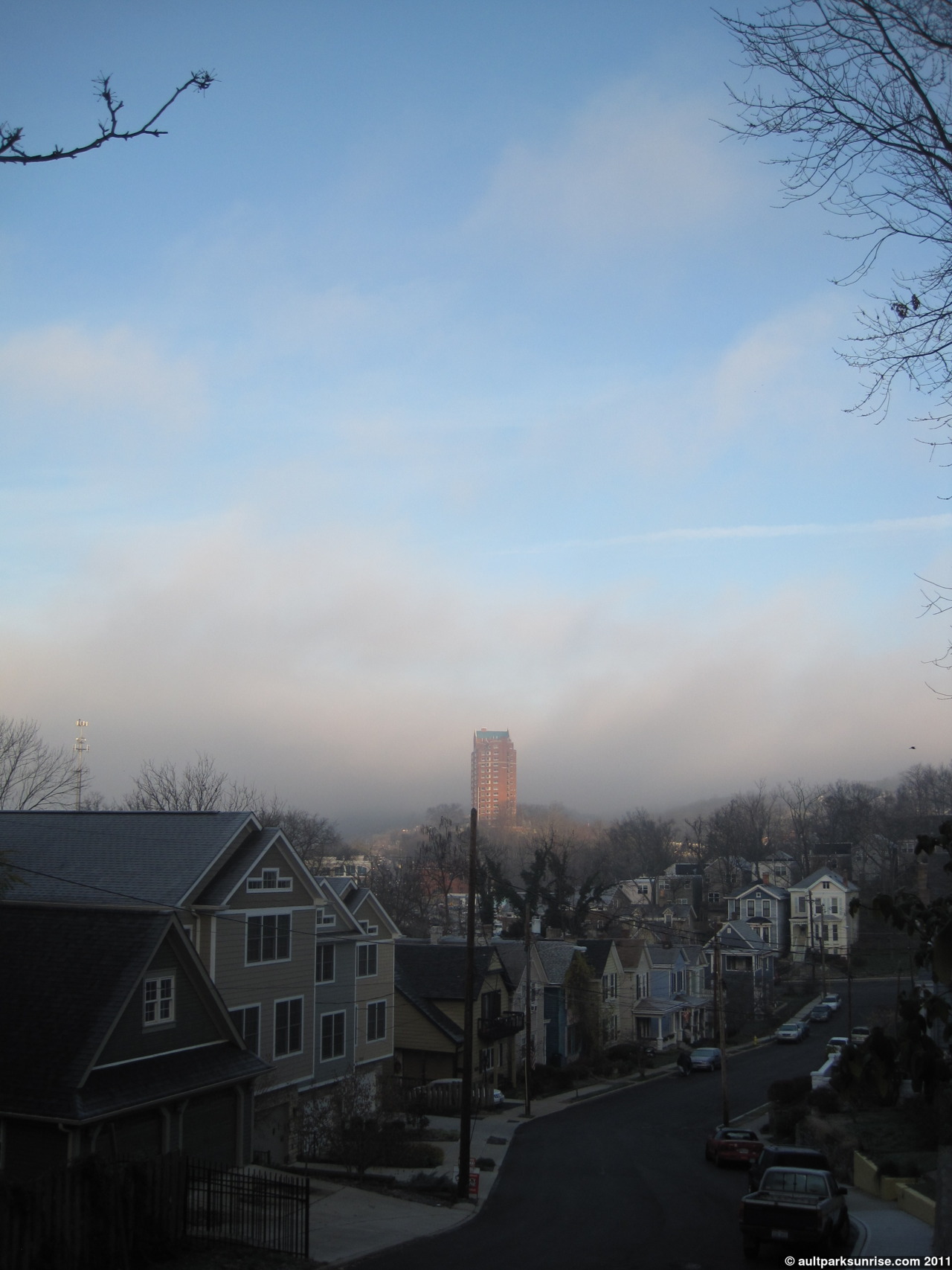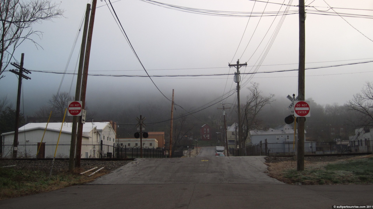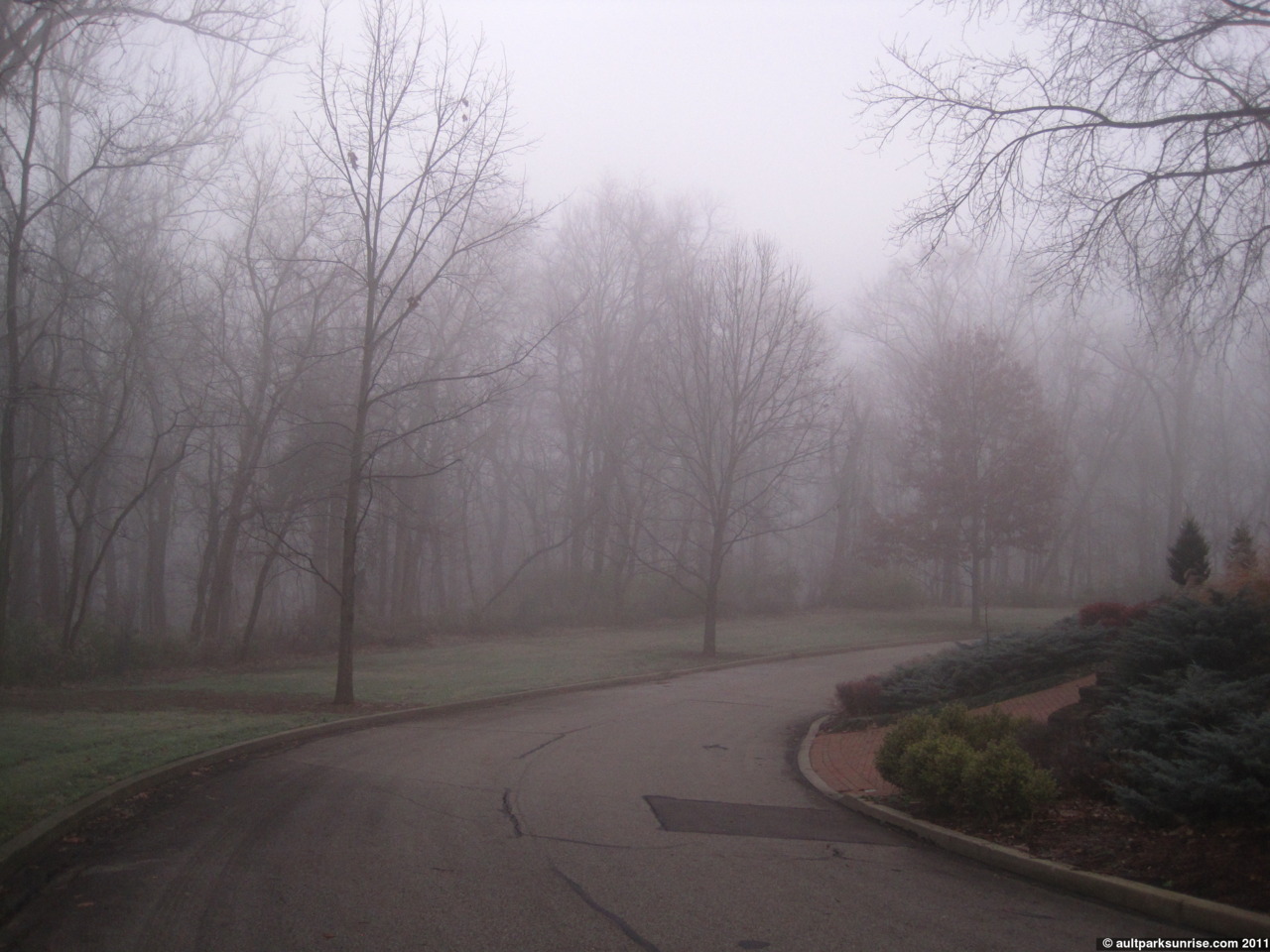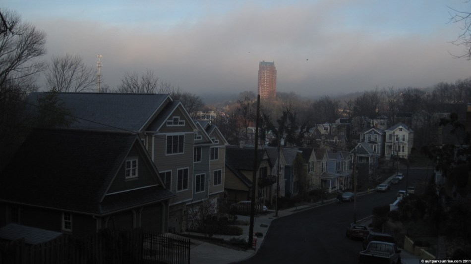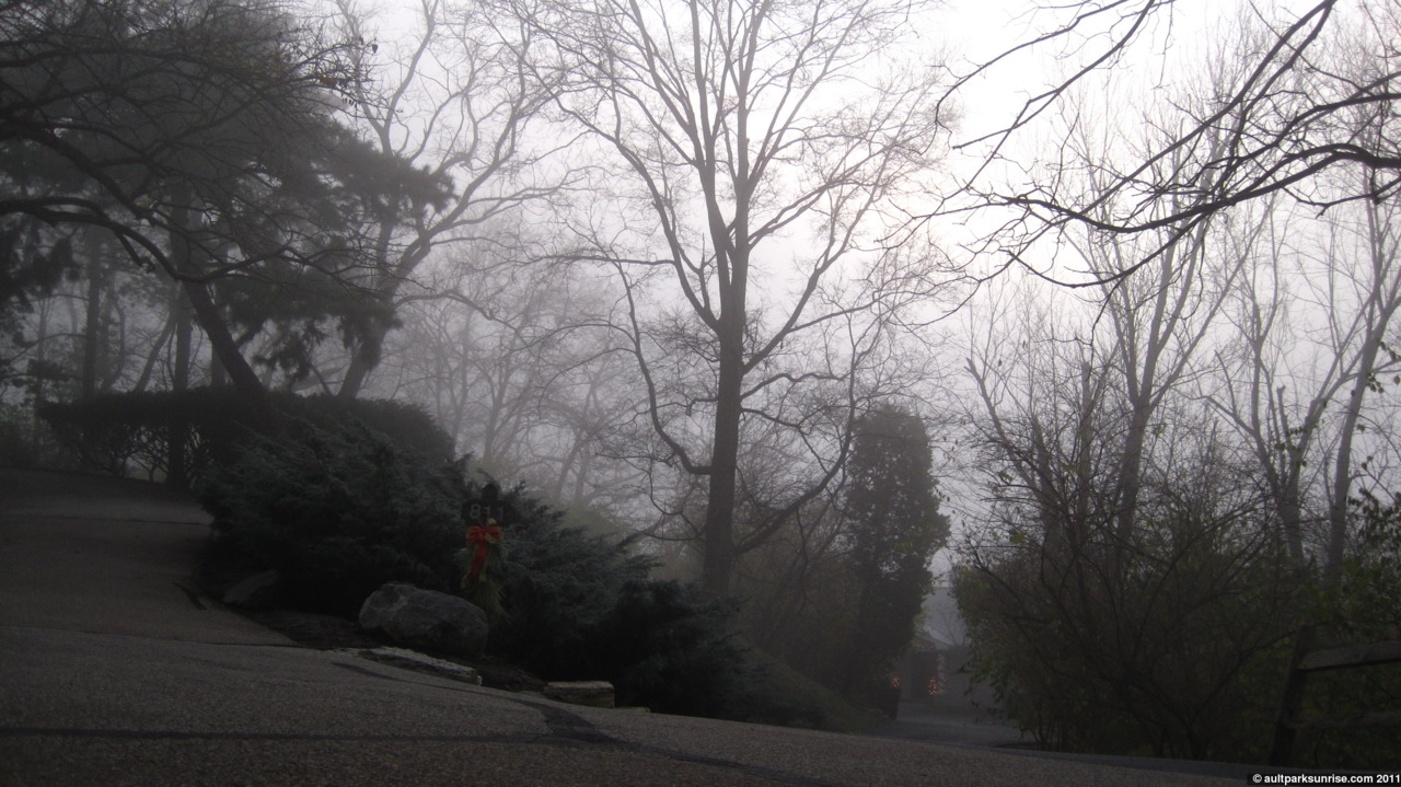 So far I’ve spent foggy sunrises at Alms Park (one of my favorite posts this fall), Lunken Airfield, and Ault Park. This morning when I set out for my twilight ride, I decided that I wanted to go back to my roots and explore some residential pockets that I haven’t visited for awhile. You see, last autumn before Ault Park Sunrise was even an idea, I started my exploration of my local neighborhoods, hills, and parks on my bike. At the time of course I didn’t know I was actually training for Ault Park Sunrise. My first fog explorations was when the neighborhoods were new and unexplored and so I would creep along the No Outlets and see the beautiful homes and landscapes that Cincinnati’s old residential neighborhoods are known (because the homes and plots of land fit snugly into the hillsides so there are lots of creative designs). This morning I wanted to revisit some of these No Outlets in the fog and see what else I could come up with.