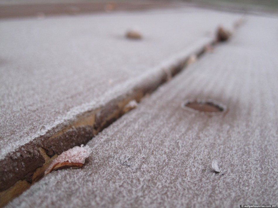 Frost crystals on a picnic bench @ Alms Park