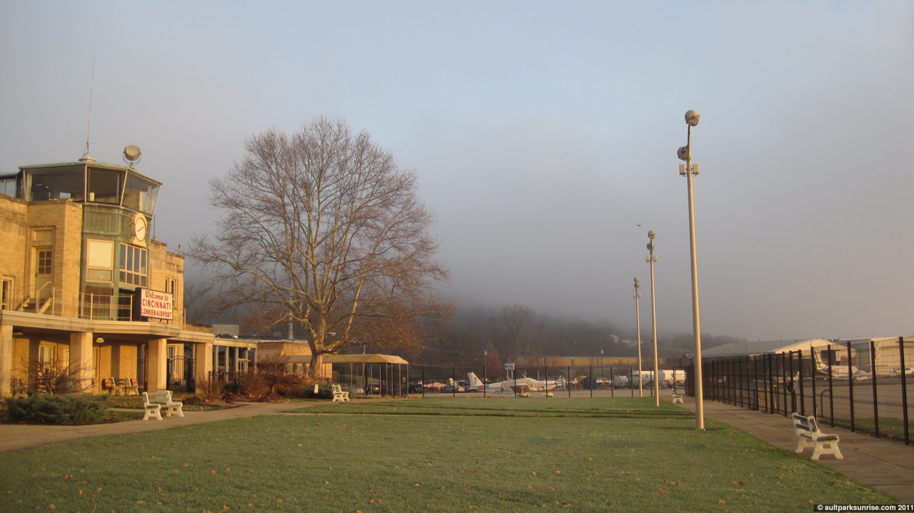 As it turns out, the weather this morning was one-of-a-kind. Normally when the fog comes through, it is in both Mt. Lookout AND down in the river basin. OR it is in the river basin alone and not in Mt. Lookout. This morning, however, there was no fog down in the basin so Mt. Lookout was covered in a low-laying cloud layer. I ended up dropping down into the basin to visit Lunken Airfield after realizing that I could get a much needed workout in. The clouds and fog had just broke and the sun was blazing through across the horizon underneath the cloud banks. It was really pretty and surreal because I could look behind me and see the hillside of Mt. Tusculum rising up from the clear streets of Columbia Tusculum and East End to disappear into the thick fog.