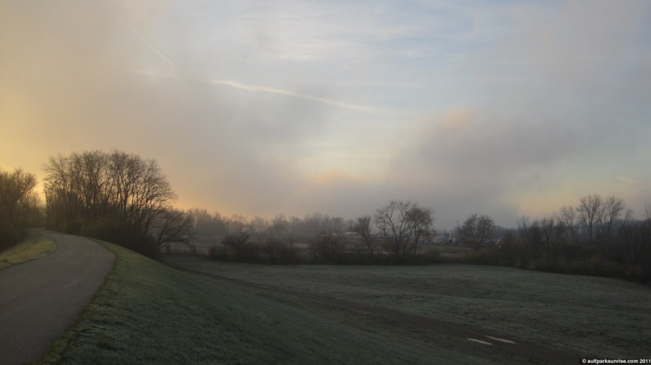 After two cups of coffee I booked it down the hill to East End and decided to take the bike path over to Lunken Airfield. I was feeling a bit self loathing after taking so much time off during the Thanksgiving break from biking and the climb up the hill did me some good! I love this picture because it conveys what I meant when I said that it was clear along the streets, but the hill disappeared up into the fog! Up on top of that hill in Alms Park’s western overlook.