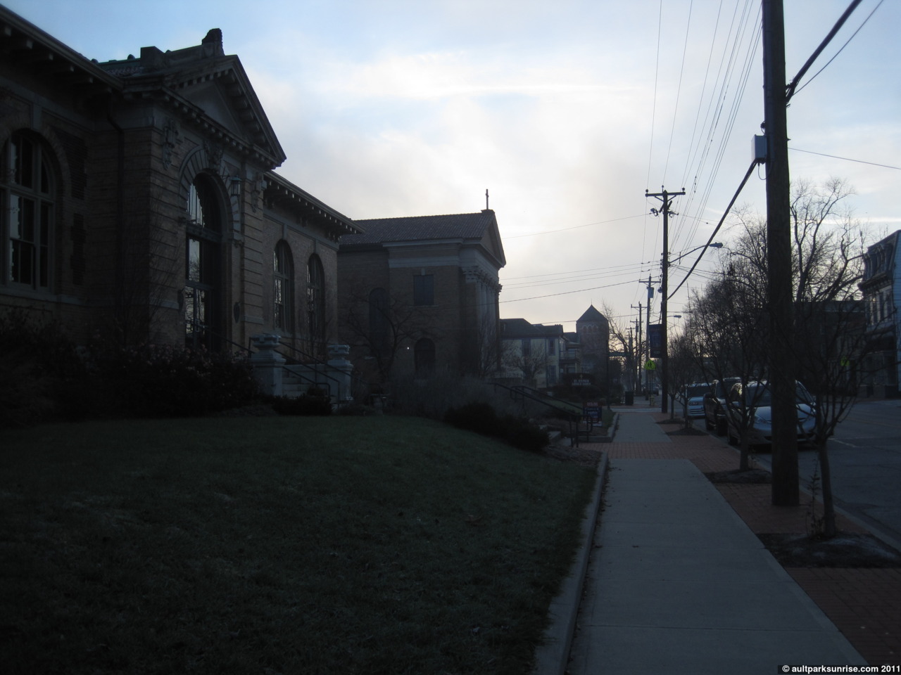 I ventured on down the hill towards Alms Park and snuck up into one of the “No Outlets”. Have I mentioned how much I love the No Outlets in these old Cincinnati neighborhoods? In this particular No Outlet we can see the curvy road winding along the forest of Alms Park. There are cherry trees that line the hidden street, something that I haven’t seen very often. Although they may be maintained by the park service now that I realize they’re on the forest side of the street.,,