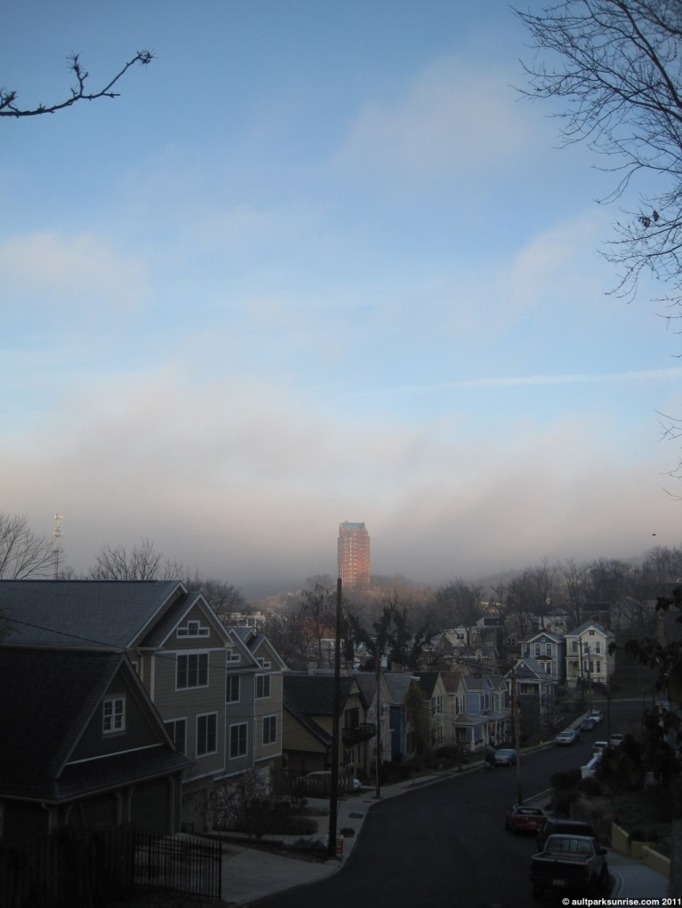 Climbing back up the hill I get a peek at the Meridian. It is now lit up with sunlight as it rises up out of the fog. I have the manager of the Meridian’s phone number and I have been meaning to call and ask if she’d let me do some sunrise pictures from atop the building. I’m kind of afraid to ask because I the idea of the possibility is sometimes more thrilling than the possibility of rejection 😉