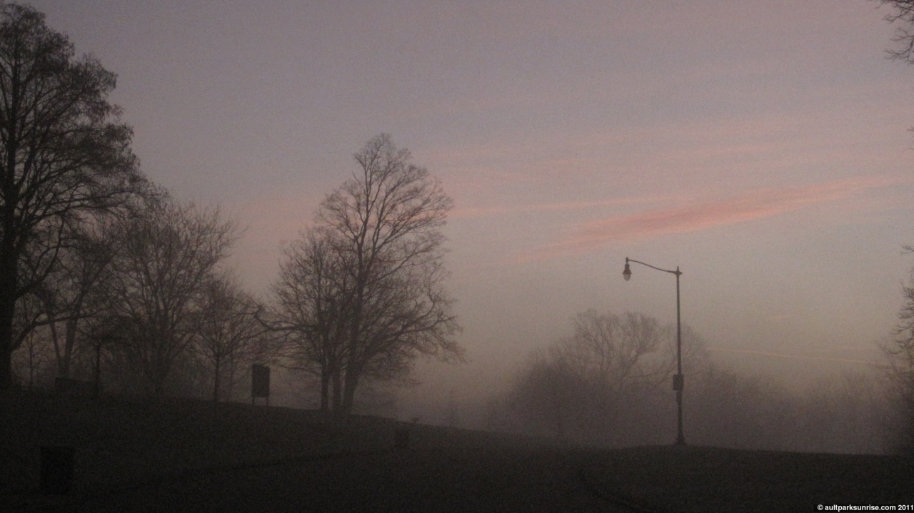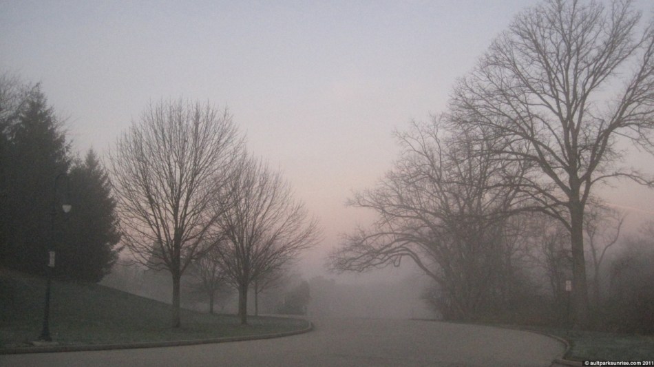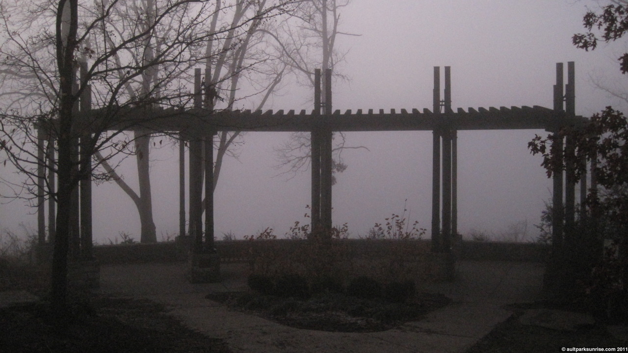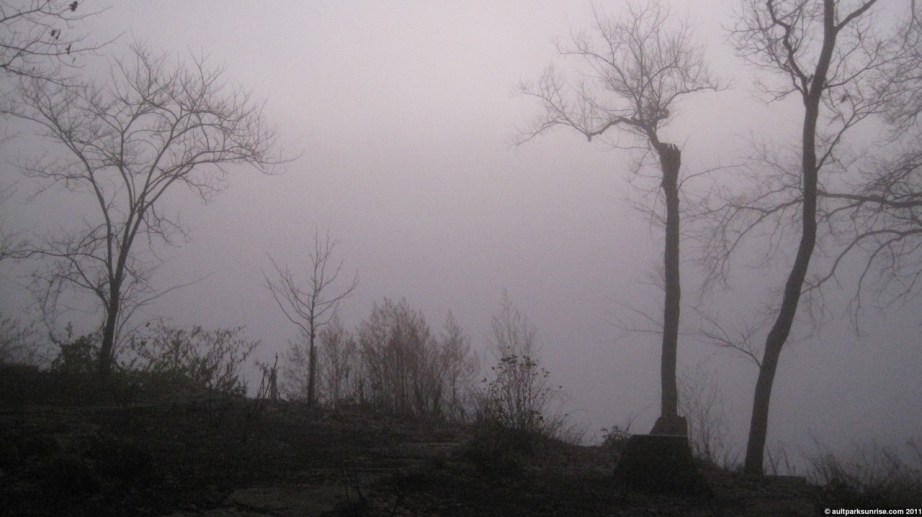 The atmosphere this morning was foggy for the second day in a row. I’m beginning to wonder if we’re close to setting the record if such a thing ever existed. I could see the sunrise’s deep red glow from Mt. Lookout Square, where I stopped by UDF to get a coffee refill, but by the time I climbed up to the park the fog had blown in from from the valley. The fog started to get thick as soon as I entered the park.