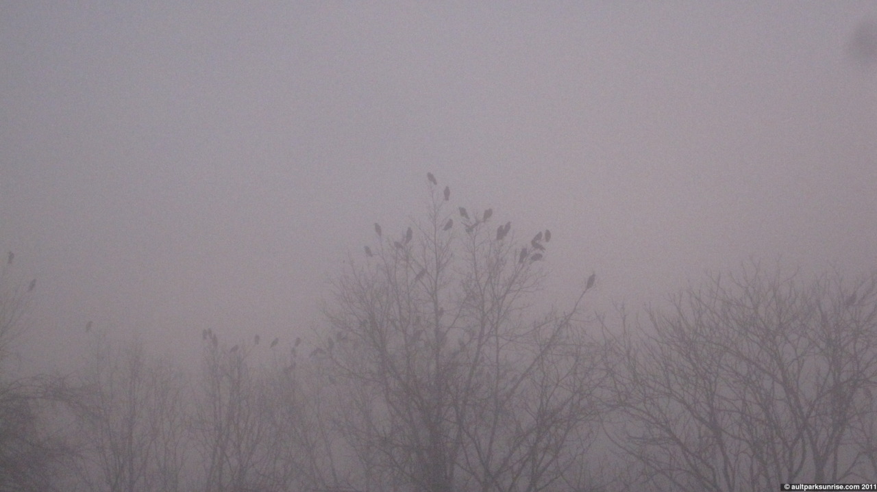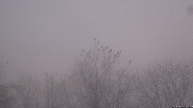 The strange thing that really stuck out to me this morning was the bird activity in the park. It was almost as if today was the day that the swarms of birds chose to gather in Ault Park before heading south for the winter. I have no idea of sparrows or crows migrate, but both birds were present in outstanding numbers this morning, filling up the sky and making a whole ruckus of noise! I even have a video of the “Murder of Crows”. There were at least 100 (I took a video) crows high in the trees this morning and their silhouettes were easy to find against the bright white background and naked branches. I’ve seen a handful at a time of these giant birds at the forest’s edge looking out over the valley, but this morning the murder moved together in a loud, squaking, organized group. I could hear them even as they moved deep into the forest even though they were hidden by the fog.