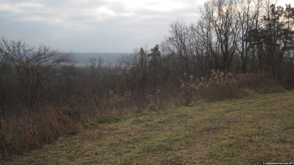 Here we are, at the northern tip of the park by the road that goes back towards the park service building. In the summer this meadow is full of local wild flowers and insect life. Now it’s been cut back. But the real reason I took this picture is that I recognized a pattern here. See how the “old trees” are all around the outskirts of this meadow? It’s the same story up by Heekin Overlook and also at Alms Park’s overlook. I believe, and this is completely unbased, that this may be the site of one of the original vineyards. That would explain the open southern facing hillside with no old tree growth. Perhaps this was the second site of a trellis system? I believe with certainty that the Heekin Overlook site and Alms Park site were locations of the vineyards, but this is the first time I have considered this meadow which is located on the northern side of the pavilion.